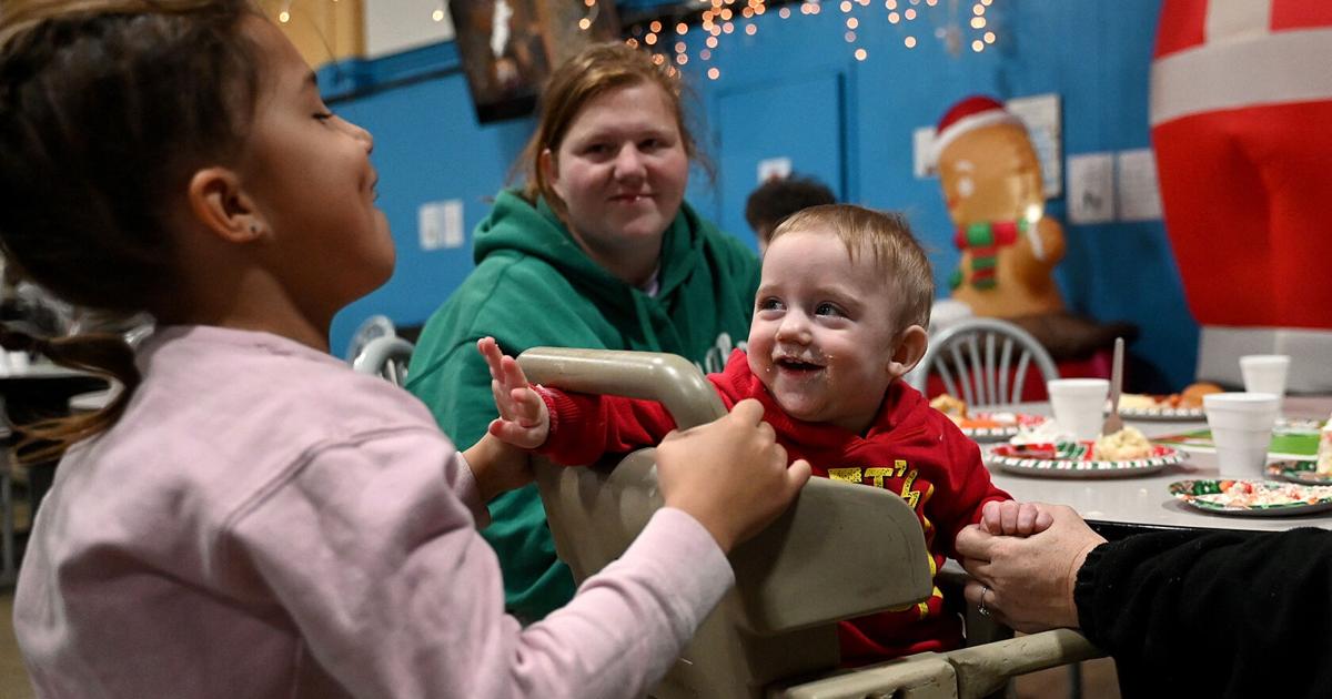 The meal at Ryves Youth Center included ham, mashed potatoes, baked beans, glazed carrots, rolls, cupcakes and home-made sugar cookies. Staff decorated the gym with Christmas trees and holiday lights.