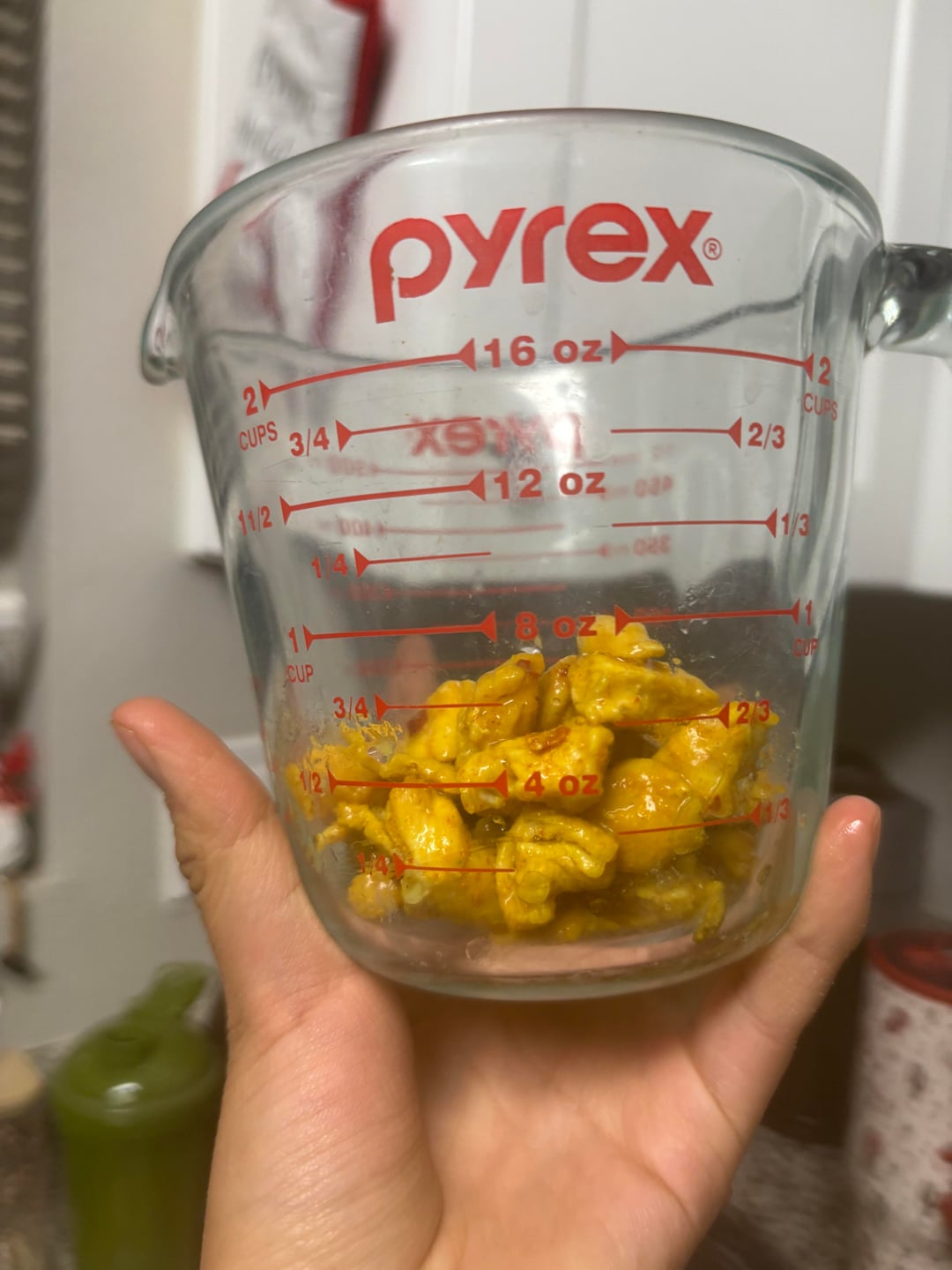 apricate the attempt at giving some quantitative data w the measuring cup but unfortunately its really only useful for volumetric measurements and this is def not 8oz of cooked chicken lol