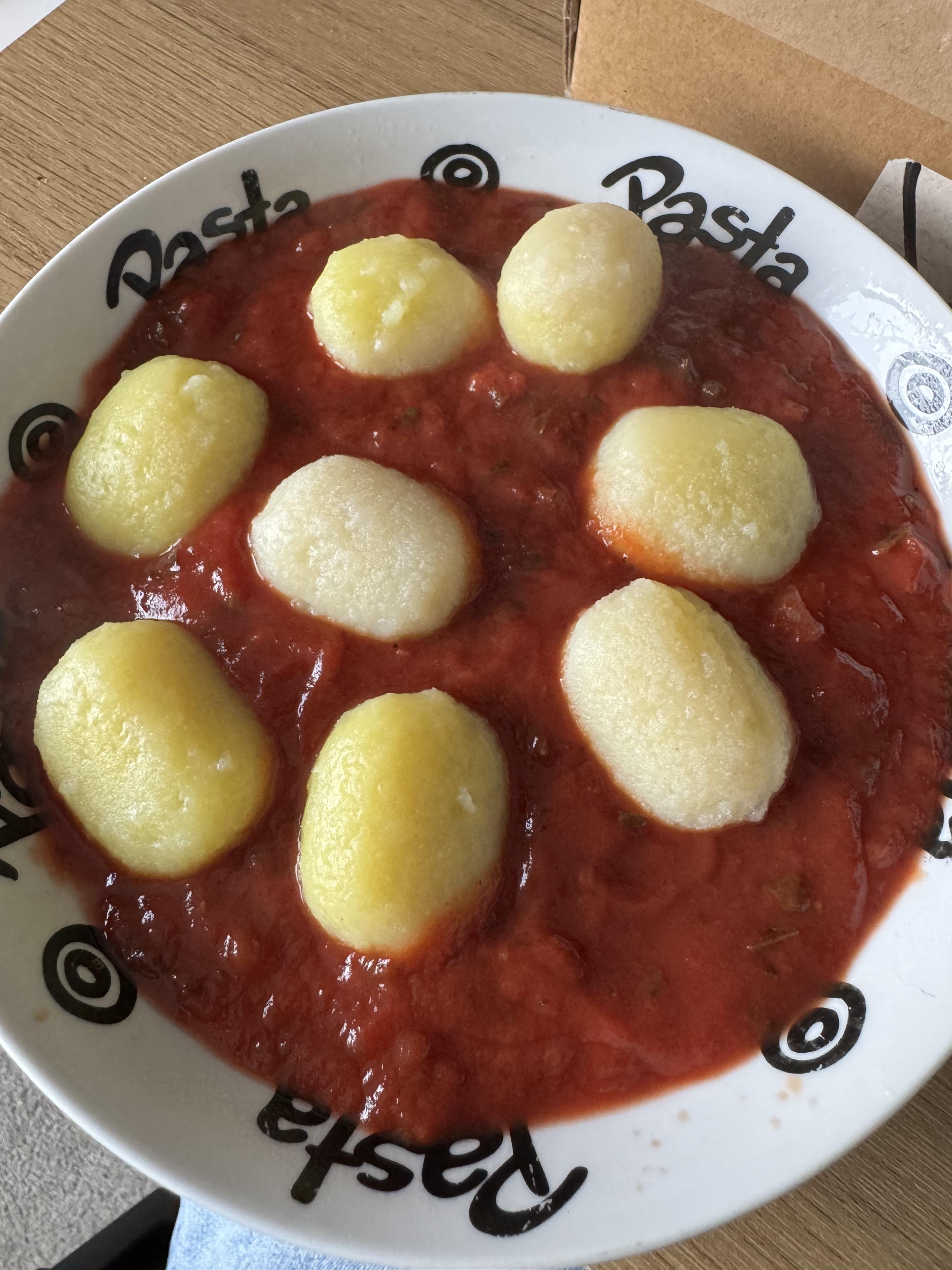 Work from home cheap & lazy lunch, ricotta & porcini mushroom gnocchi with far too much tomato & basil sauce. Cost less than £3 to make 2 portions from Lidl.