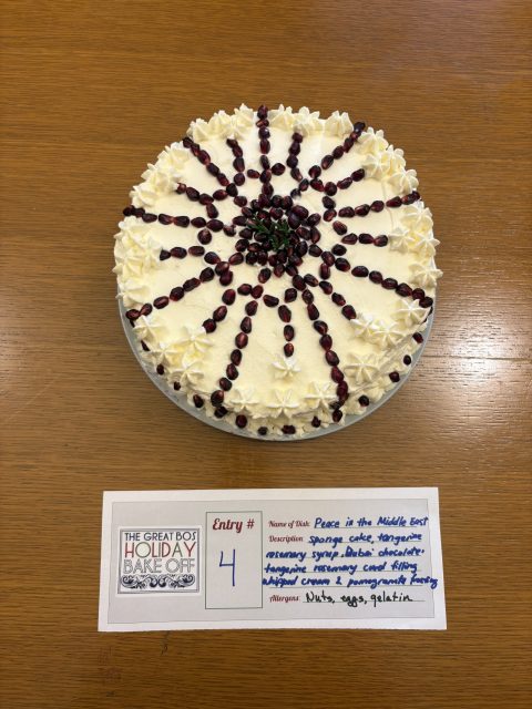 Visually stunning honorable mention: Supervisor Myrna Meglar’s “Peace in the Middle East.” It featured dark pomegranate seeds arranged to look like the Bahai star, which stood out starkly against bright white frosting. The cake itself featured a tangerine rosemary syrup and curd and Dubai chocolate.