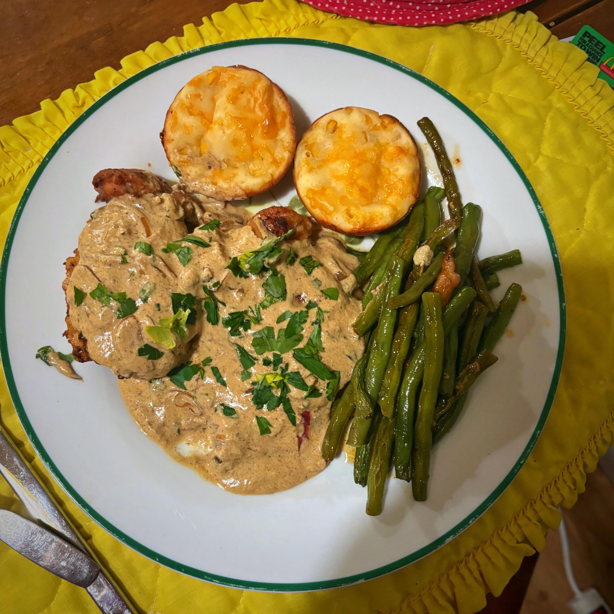 Creamy Dijon chicken roasted chicken thighs with corn cakes & green beans