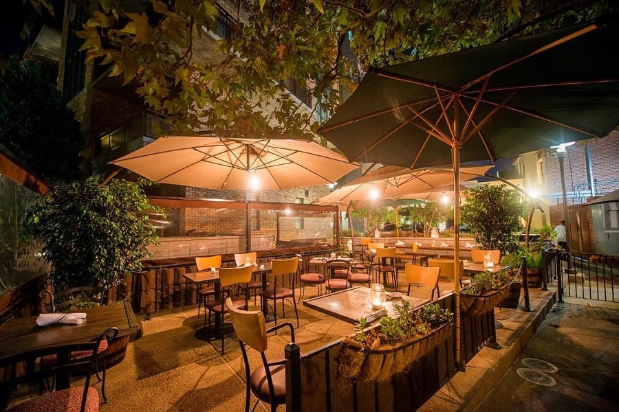 Hidden behind the main dining room, this greenhouse-style patio feels like stepping into a charming European conservatory. Lush greenery surrounds intimate tables, creating a serene escape from the city bustle that’s perfect for everything from romantic date nights to special celebrations.