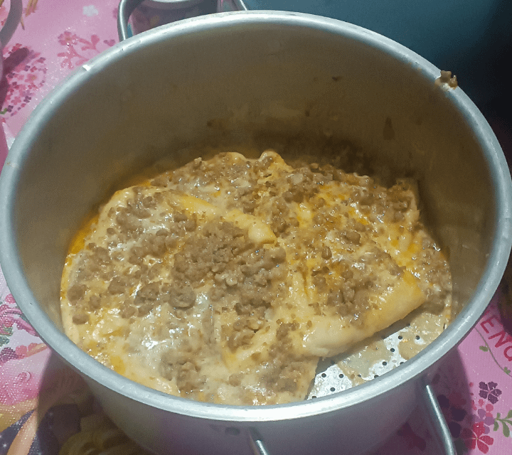 Yeah, judging only from the way it looks, I don’t know if crumbles of breakfast sausage thrown on top of wet lasagna noodles counts as pizza . . .