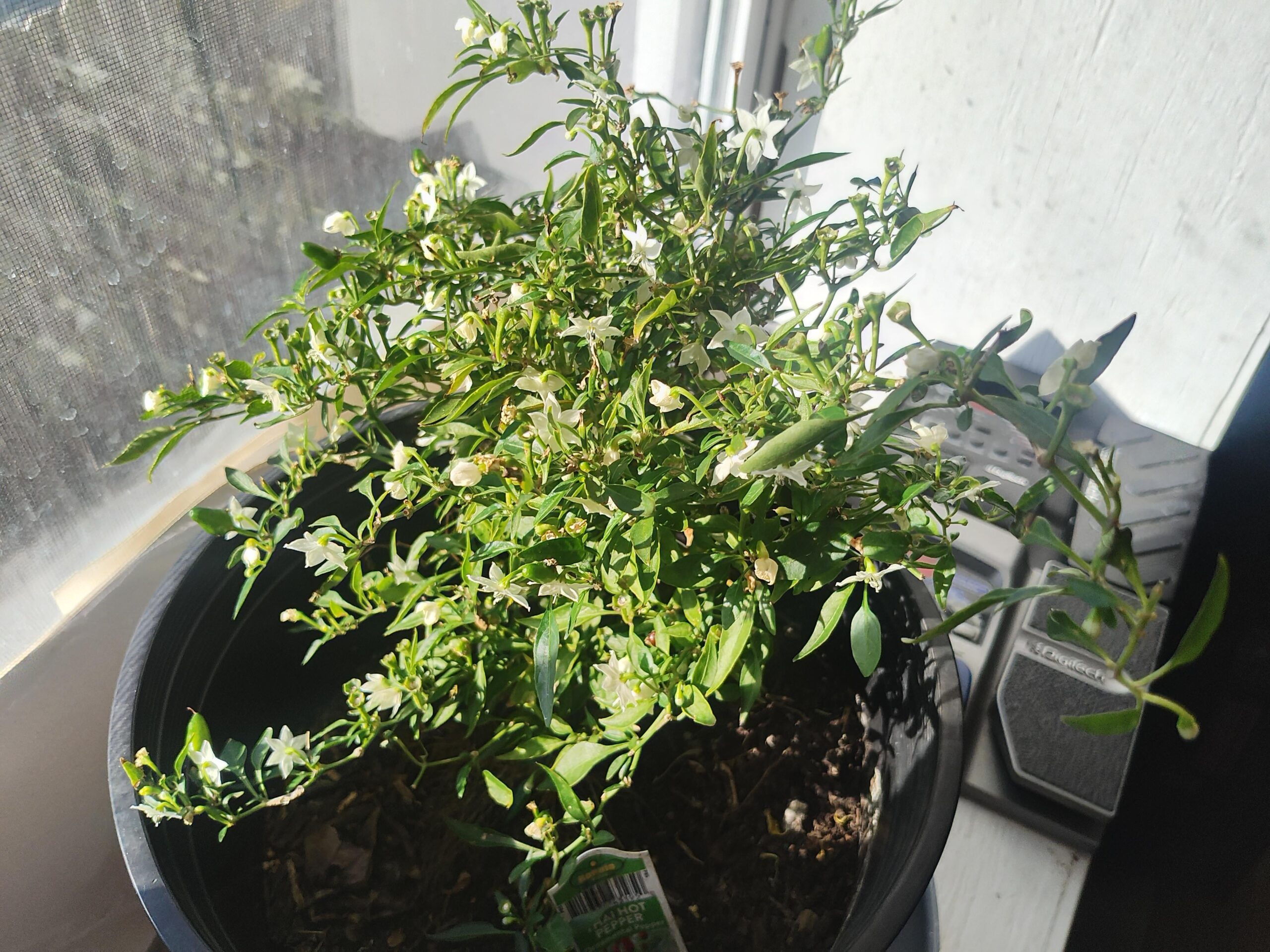 I brought this Thai chilli inside so it could live. It has easily double the flowers that are visible in the pic. I've never seen this many flowers on a small plant before. What is the exact mechanism to initiate flowering?