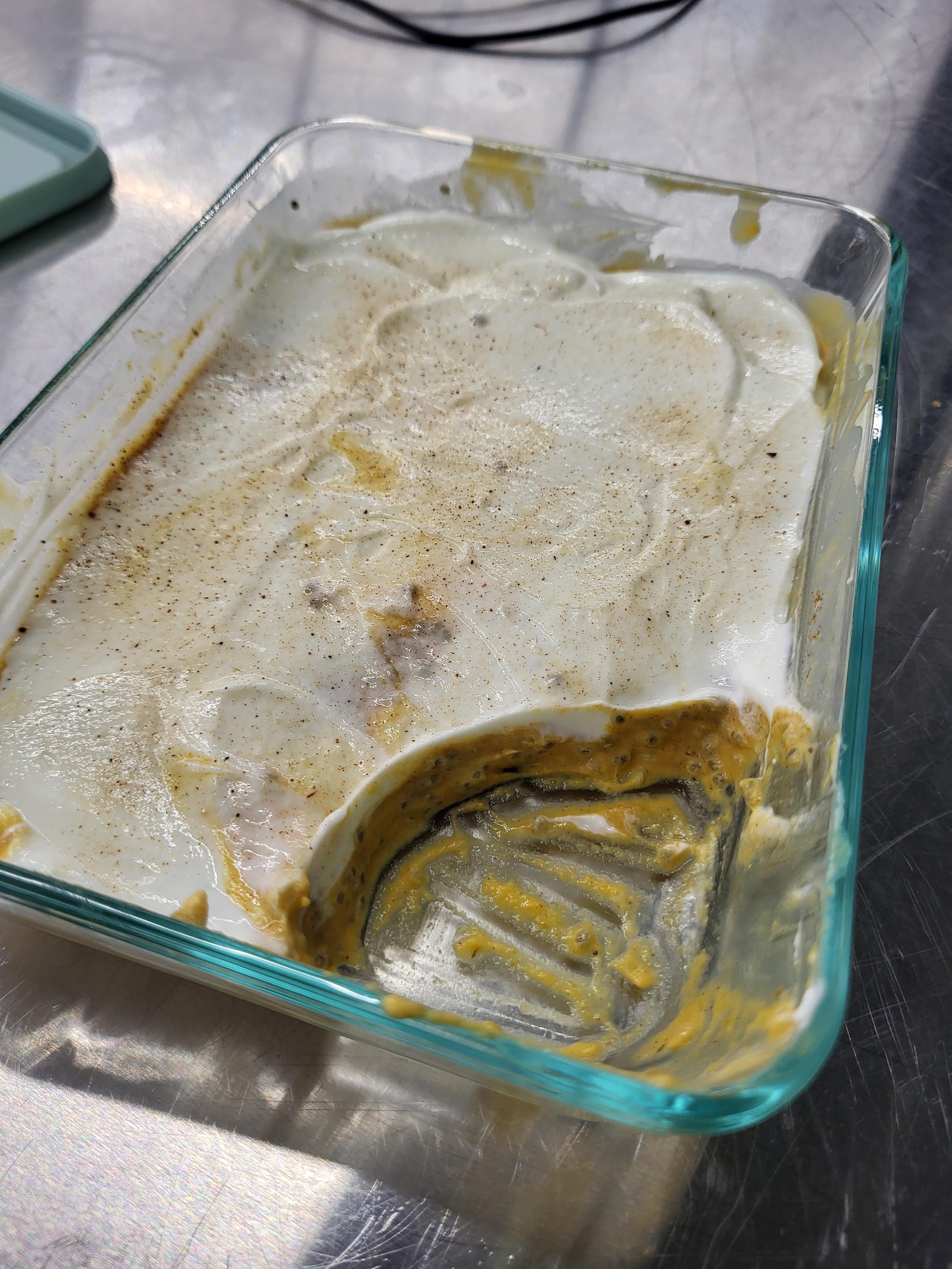 Entire container comes out to around 250 cals!! And 18 grams of protein. And if you don't like stevia, replacing it with sugar would only add around 10 cals, I just have stevia to use up. (Container I used is a 3-cup Pyrex container. I think 4×8"?)