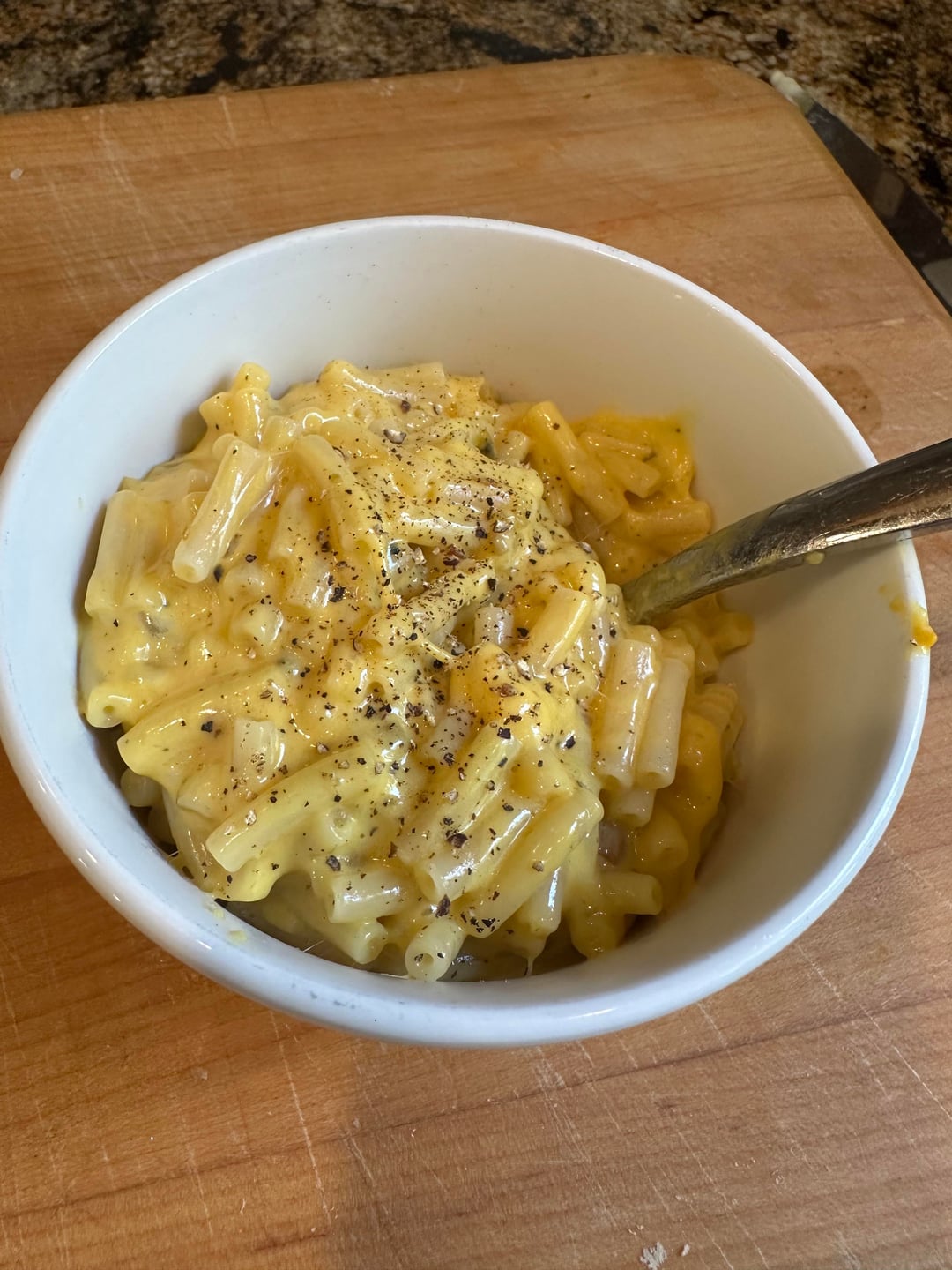 After following box instructions (replacing milk with half and half) add 2 Tbsp shredded mozzarella & 2 Tbsp shredded sharp cheddar and 1 Tbsp NM green chili. Mix well and serve hot. Top with a little cracked black pepper.