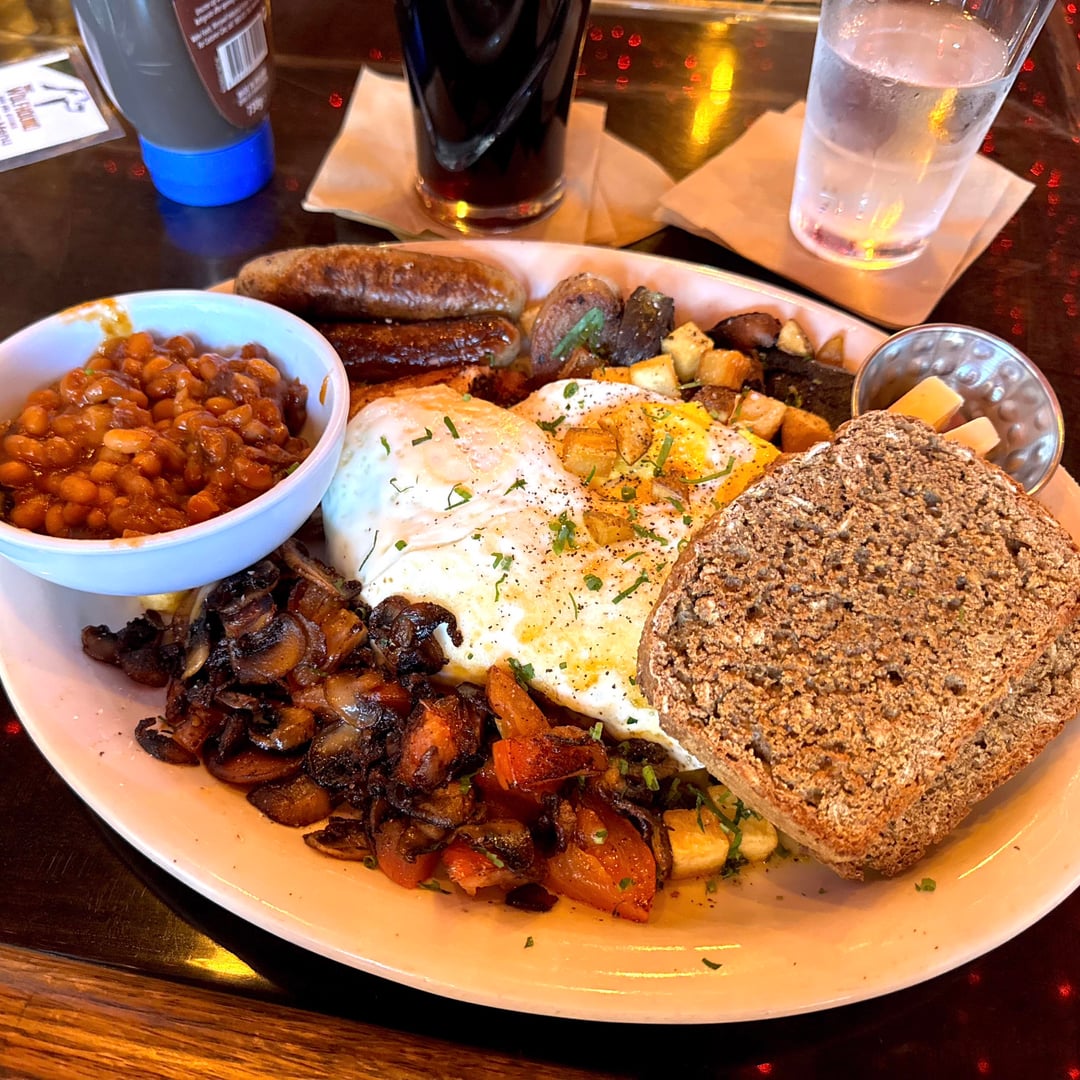 Good four pork breakfast (sausage, bacon, black and white pudding, I think Winston’s) mushrooms & tomato’s and batchelors beans. Good toast too! Only slight knock on it would be that I’d take a fried slice over taters but it was a damn good plate of food that checked all the fry up boxes and distracted from the Bears giving up a TD on the opening kickoff. Brown sauce aplenty and a good pint of Guinness as well.