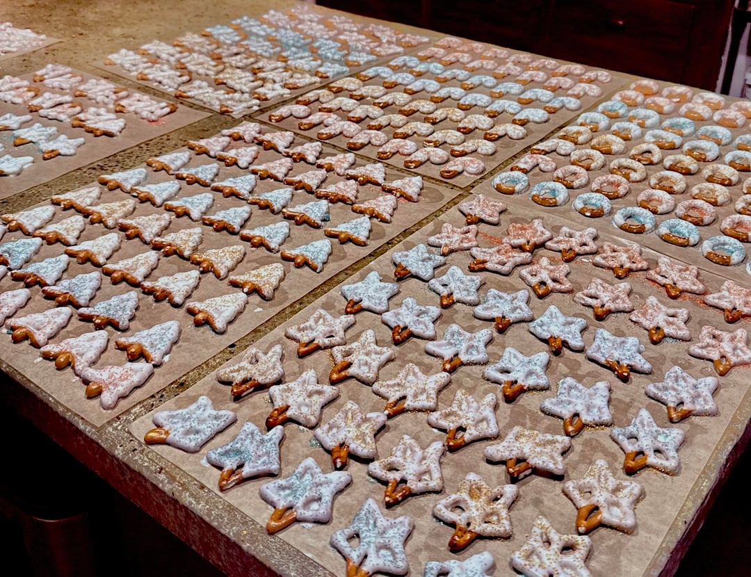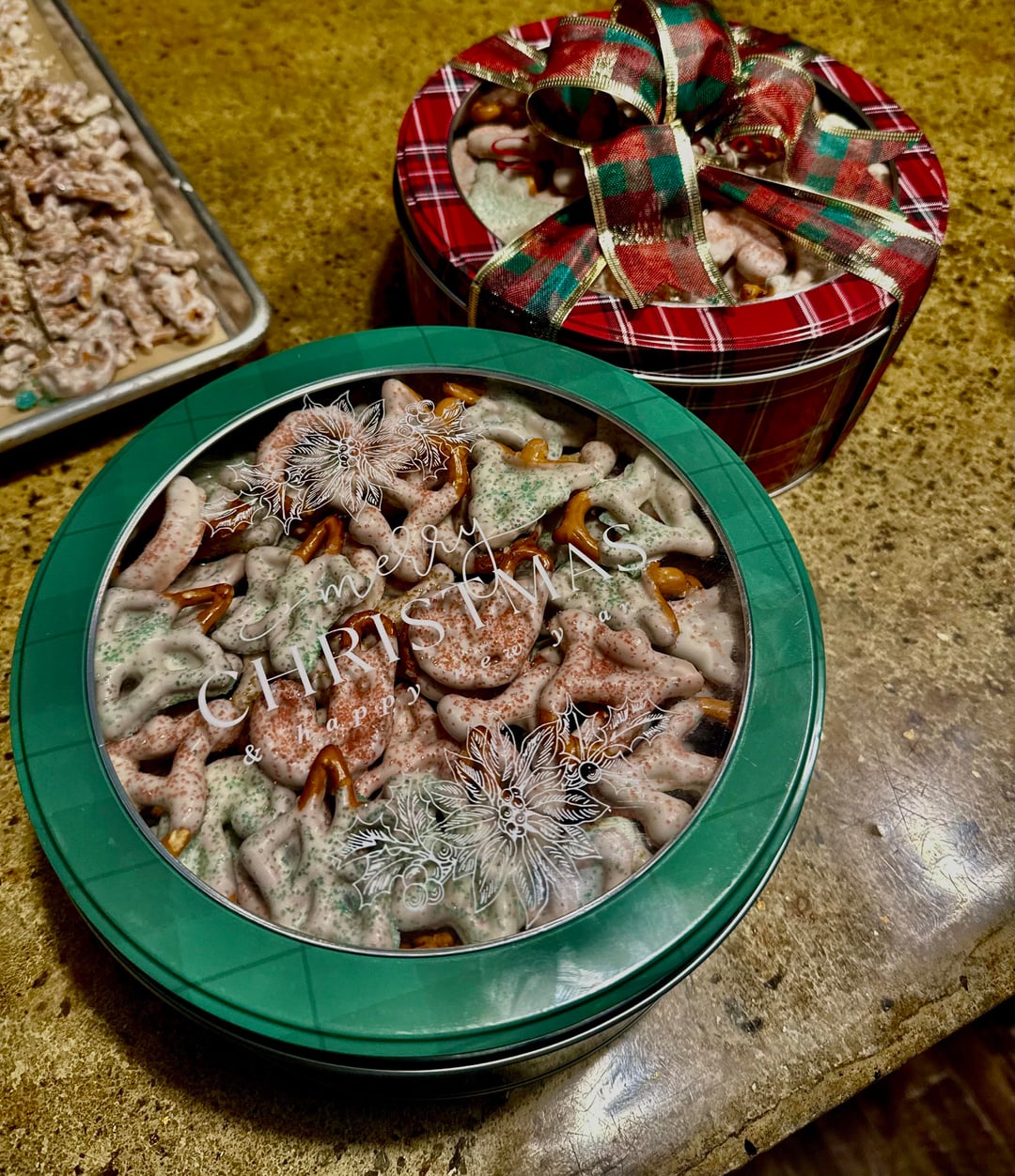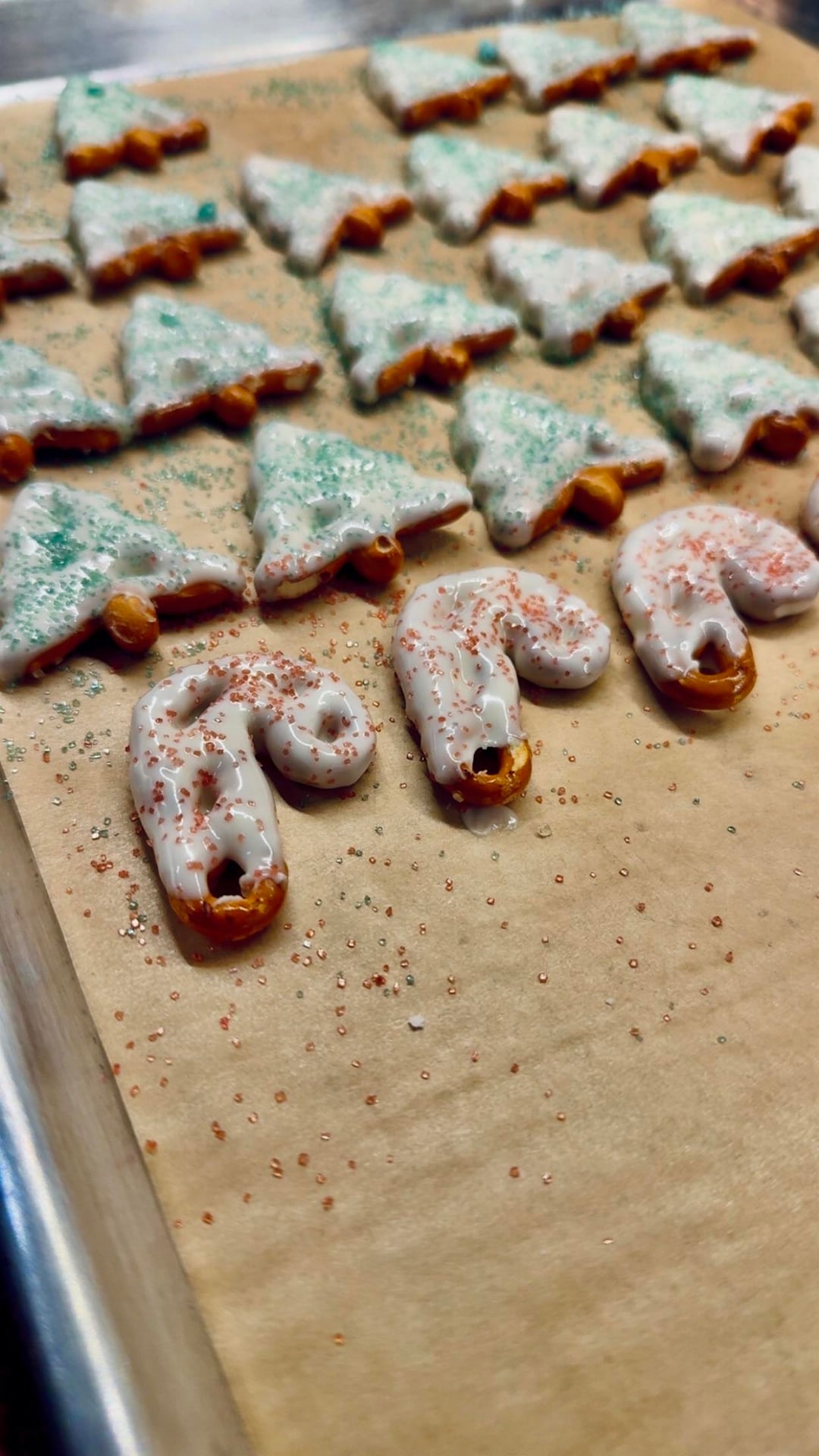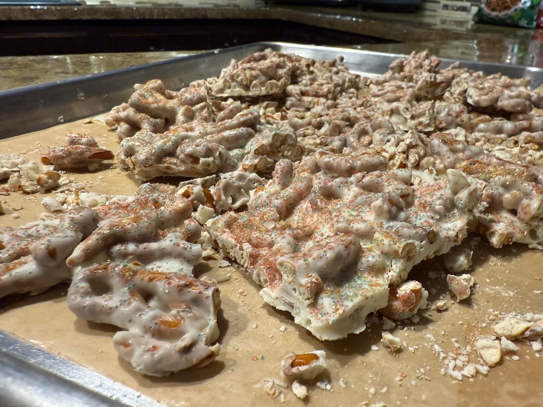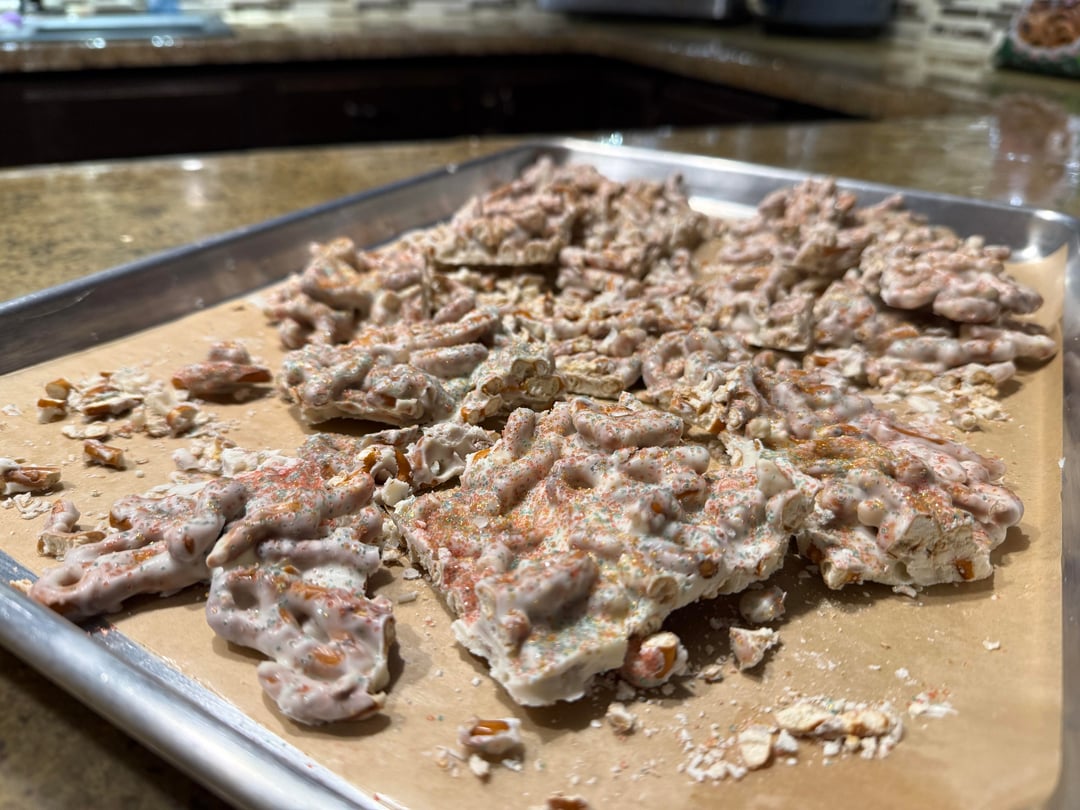 I like to save all the broken pretzels until the end. Dump them all into the pot with what’s left of the almond bark. Mix. Dump out onto a sheet pan and evenly smooth the pretzels out. Add sprinkles or whatever you want. Allow the almond bark to hard, then cut it pieces.