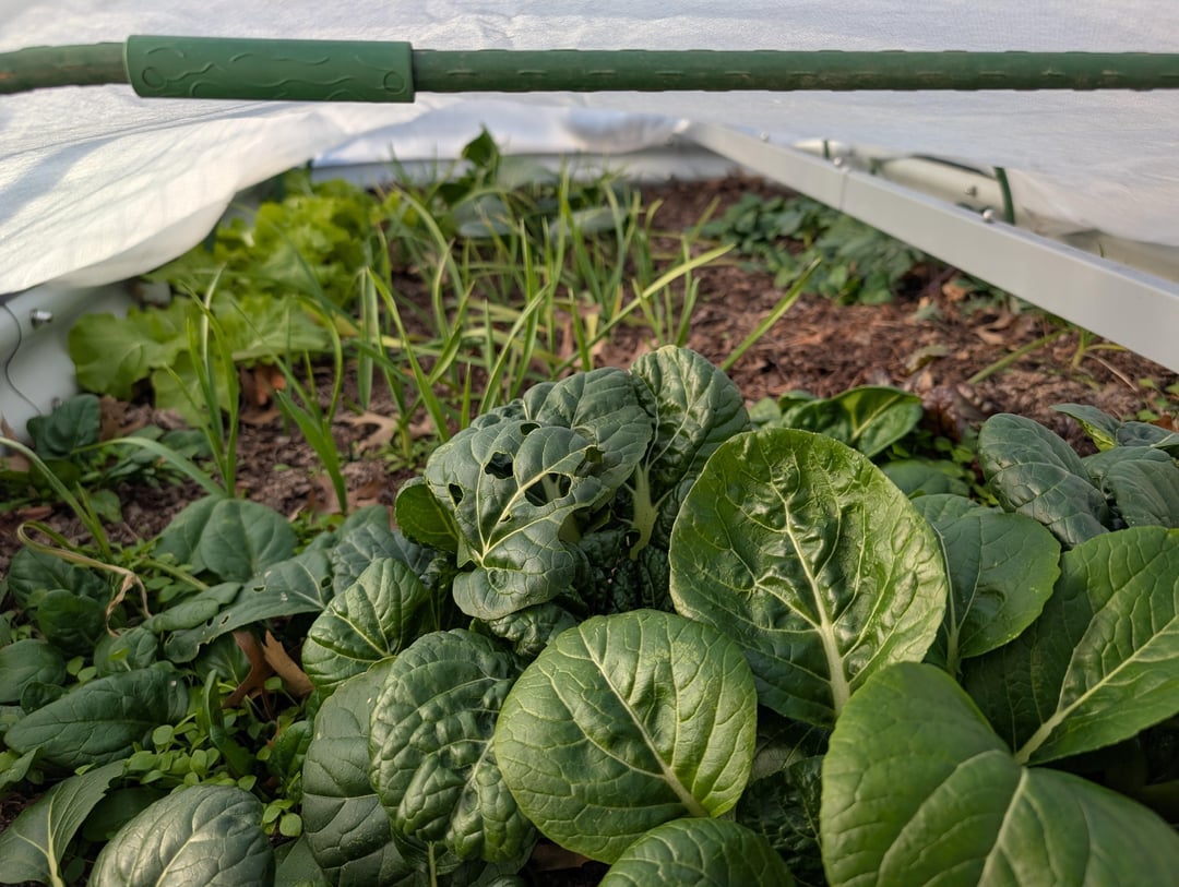 It just blends into the winter landscape, but underneath the snow and covers there's spinach, lettuce, Asian greens, onions and garlic, and strawberries, all going strong 🙂