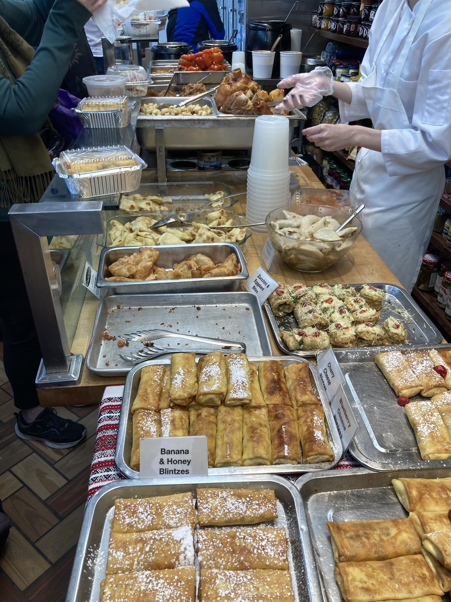 I know there are other, possibly cheaper places in the city to get this sort of food, but there aren't as many options in Lower Manhattan as there used to be and I'm very glad these guys are still around. I don't do this every Saturday—we're not exactly talking health food here—but every so often it's fun to hike over from the WV and return with a bag full of varenyky (potato-and-onion is the best IMO), sausages, bigos, meatballs, blintzes, you name it. Hell, take your bounty over to Astor Place and enjoy a Slavic feast without bracing Veselka's weekend lines. Today they had a little sample tray by the register with rye, kielbasa, and a really good spicy mustard.