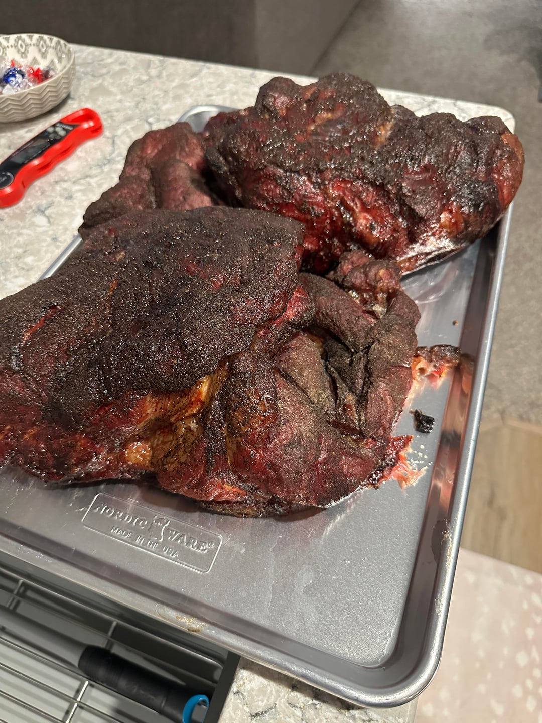 I prefer to not use the Texas crutch and leave them unwrapped or spritzed through the entire smoke. 235 for 14 hours until the internal hits 205. More about time vs temp. Probe tender.