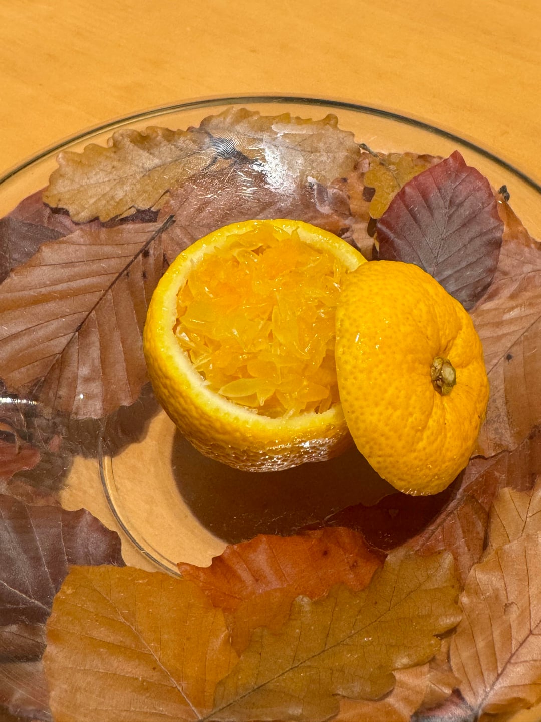 Japanese citrus pulp with Japanese wagashi jelly. Refreshing and tangy predessert but nothing to write home about.
