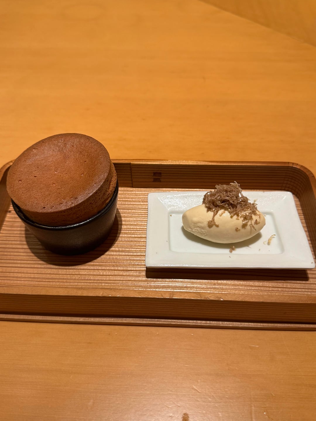 Deceptively plain looking but this was dessert perfection. Easily the best dessert I’ve had at a Japanese fine dining restaurant. The jiggly soufflé was perfectly cooked, the wasanbon ice cream refined and not overly sweet, and the white truffle brought everything together and elevated the dish. Truly divine.