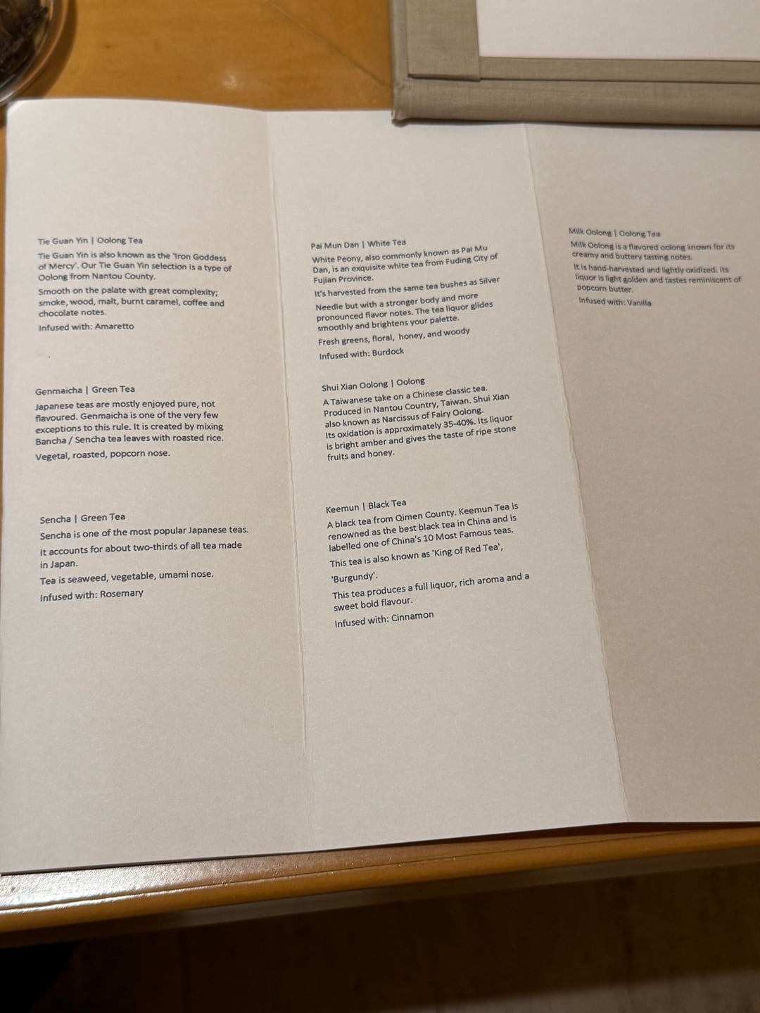 The tea pairing was also really good. It is not often you get tea pairing at a fine dining restaurant and it was a unique experience to try different types of infused teas throughout the meal (tea pairing menu pictured). The first five teas served cold and the last two hot. Each brought out different dimensions of the food and we felt it was a wonderful curated non-alcoholic pairing.