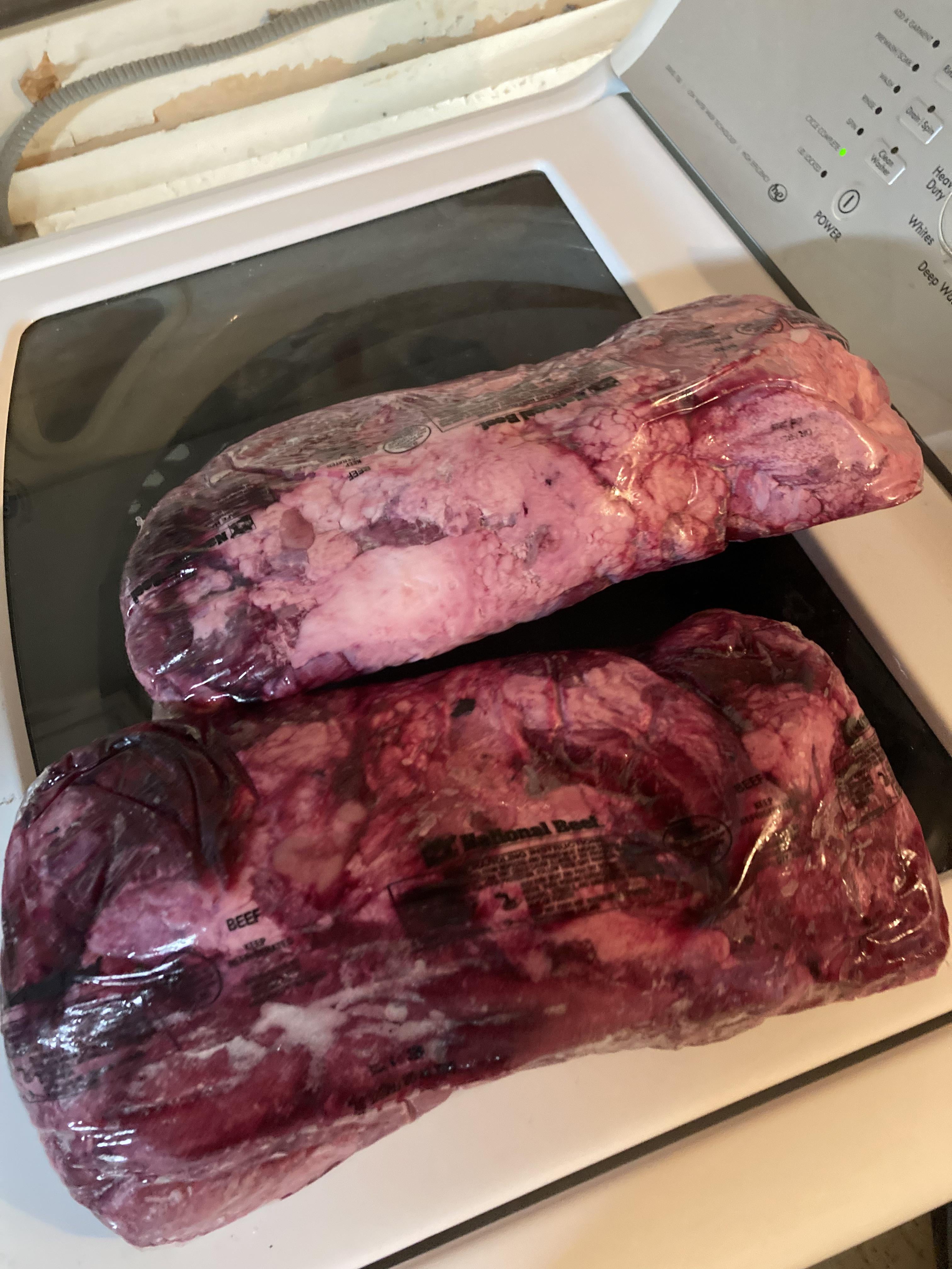 A friends wants me to make this but I have no idea what it is, and neither does he. I guess his gf was given it but she didn’t pay attention.by OSE661 15 Comments GnosticPizza 3 months ago Chuck Clod, you’ll get some English Roasts and Flat Iron/Blade Steaks. newbie38340 3 months ago Looks like beef cheek but hard to be certain until opened rawmeatprophet 3 months ago Yeah loadnurmom 3 months ago Looks like a Maytag? (badum tsss) RedditVince 3 months ago Open it up and take more images..Can’t tell in the packaging Psychological-Slip10 3 months ago Brisket strandy76 3 months ago I found a picture of something called National Beef chuck top and it looks very much like the top one.https://www.southstreammarket.com/upload/products/pb736b1ca68fb42faa41ed05223827d18.jpg?l=1662458603 AliciaXTC 3 months ago If you’re planning to wash it, make sure it’s on heavy duty and do a solid presoak first. emover1 3 months ago Smaller One looks like an eye of round roastLarger one looks like it could be a full strip loin Prestigious_Snow1589 3 months ago It’s Meat supersaiyan336 3 months ago It looks like beef cheeks which in my opinion is probably the best meat to smoke. Holls867 3 months ago Might be my ex willcook4food 3 months ago Looks like beef cheek, watch a video how to trim and smoke. Those things are gnarly looking out of the package Unable-Bandicoot-498 3 months ago Looks like beef briskets but it’s BEEF CHEEKS!! I’D SMOKE THAT!! Bcatfan08 3 months ago Washing machine