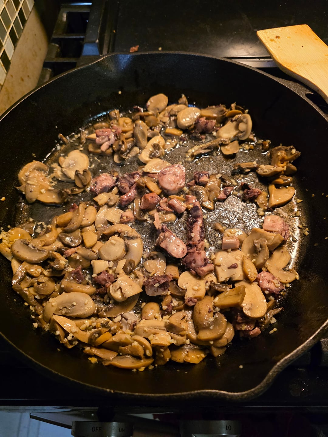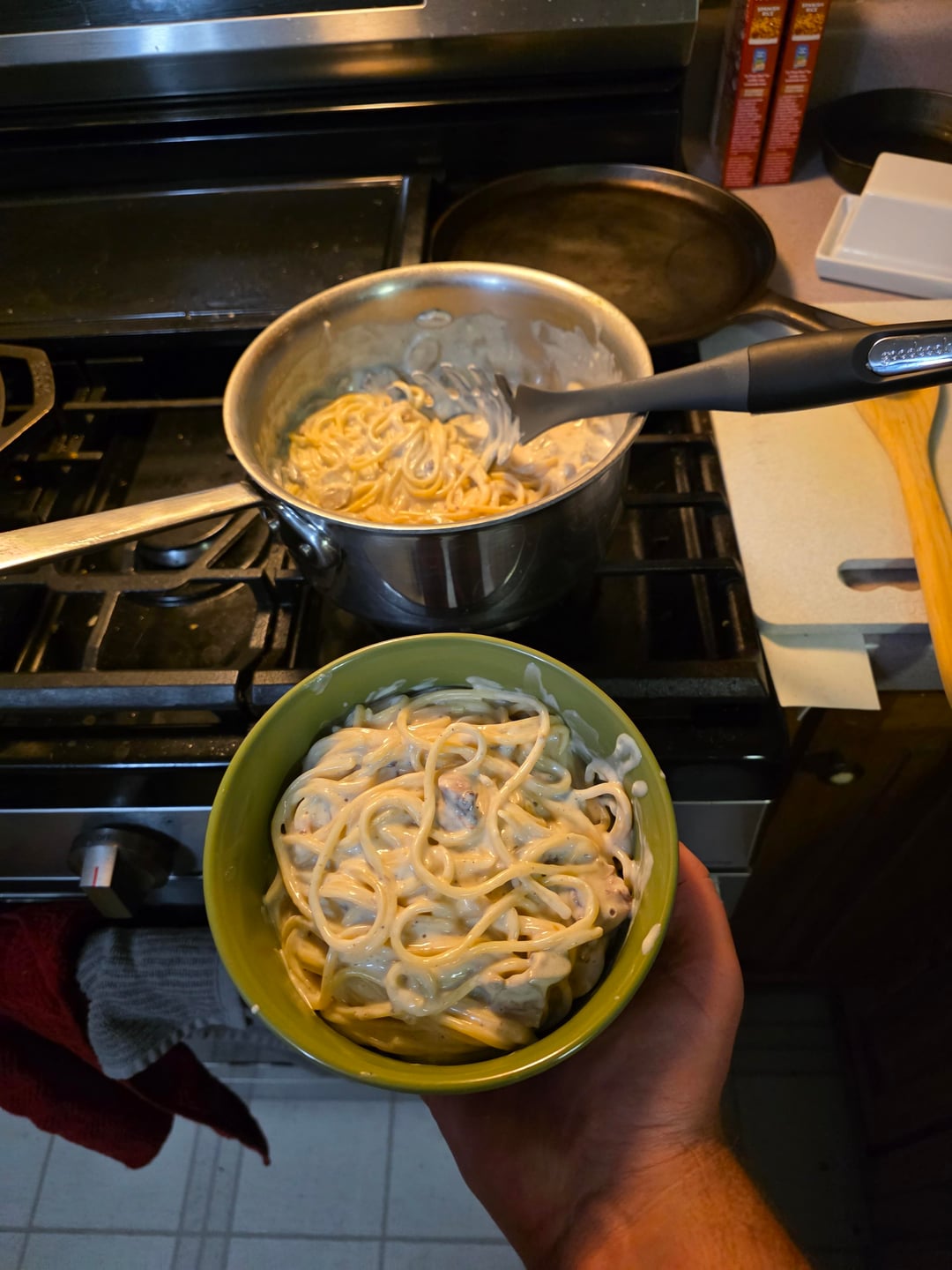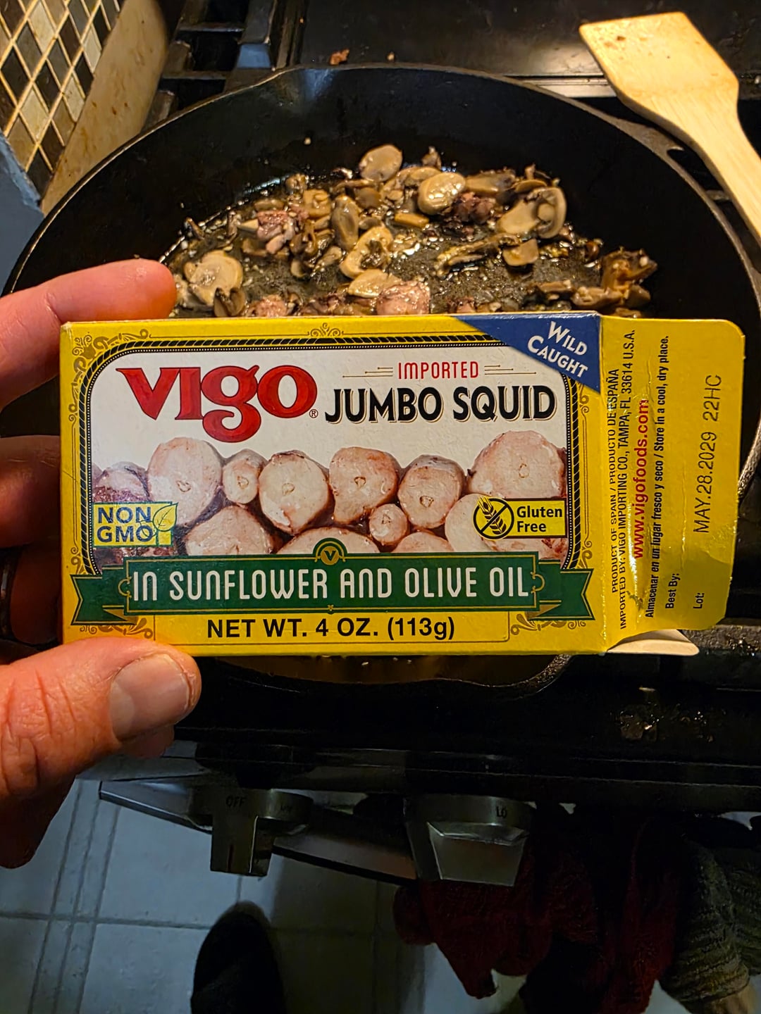 Made this last night. I thought I had another can of calamari, but I just had the one. A couple of spoonfuls of minced garlic, two cans of mushrooms, a can of Vigo jumbo squid, a jar of Prego roasted garlic Alfredo sauce, and spaghetti noodles.