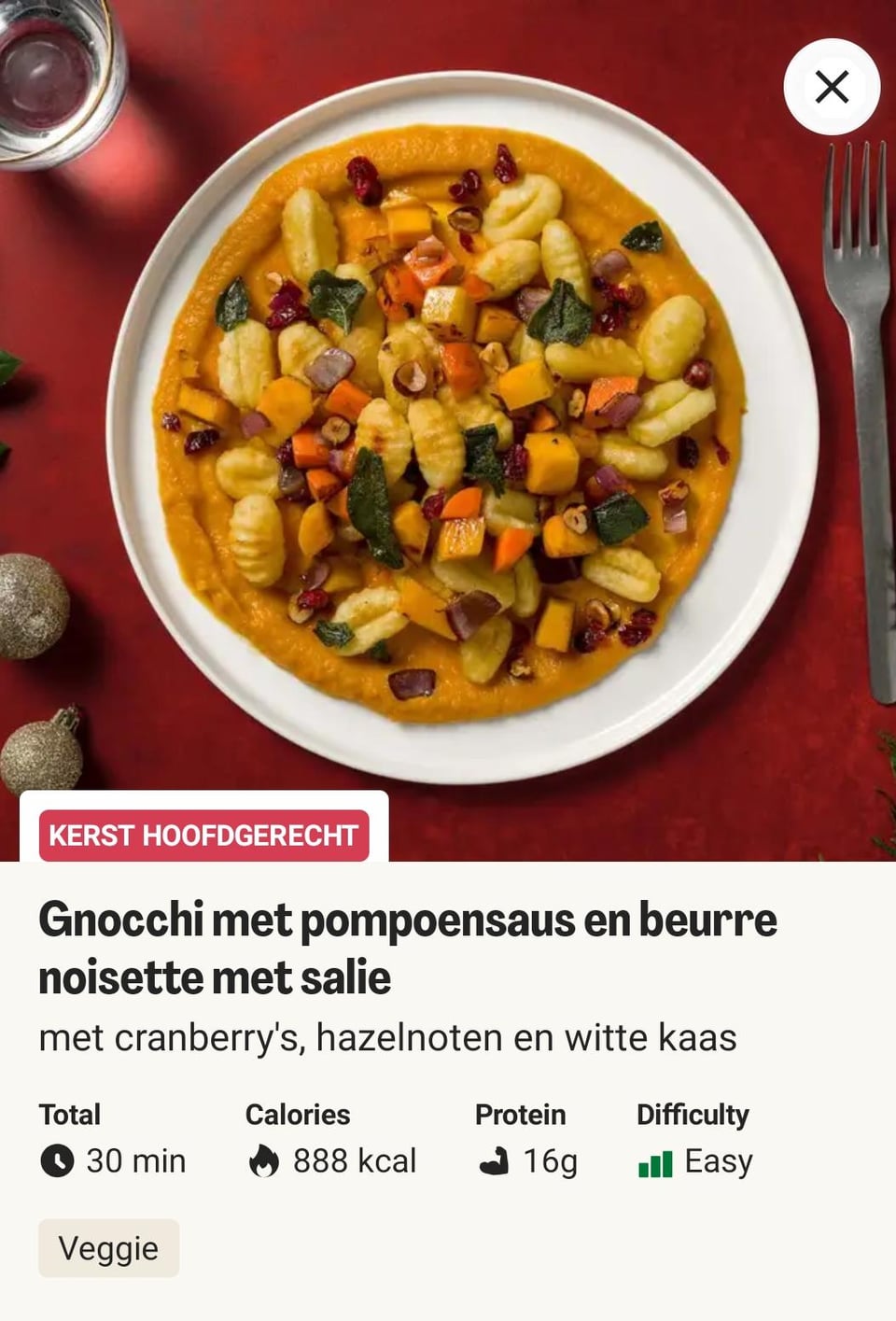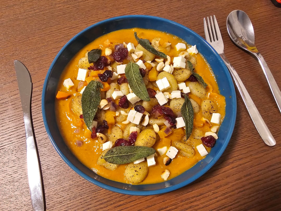 So this is from Dutch Hellofresh. It's gnocchi with pumpkin sauce with sage brown butter, crispy sage, white cheese, hazelnuts and cranberries.