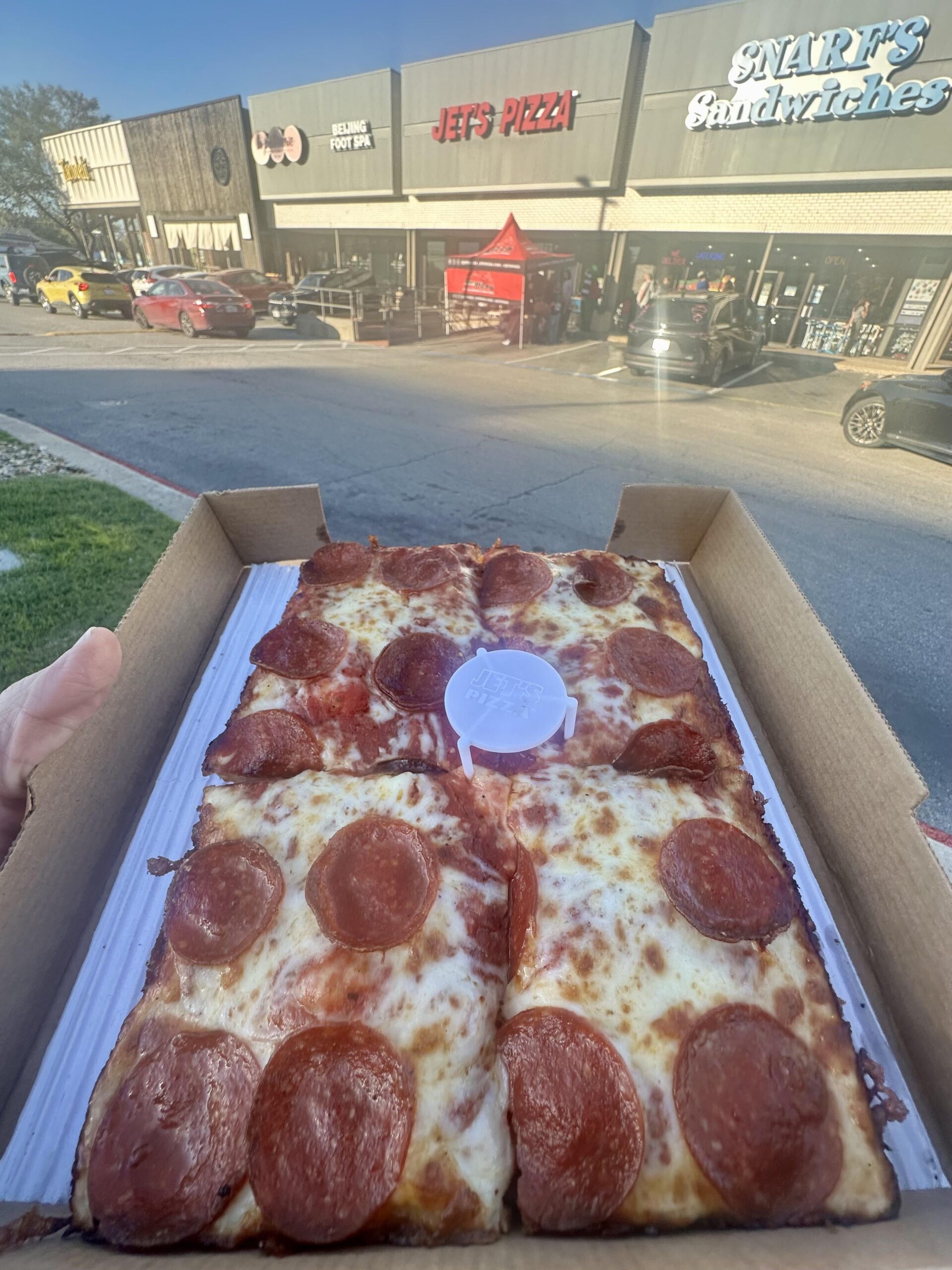 Jet’s Pizza on Burnet started giving out small pepperoni pizzas at 4pm. I got there are 4:06 and it only took about 3 minutes to pickup. No app needed, no preorders, just walk up and take a pie. They said they are making cheese ones, too. Cars are coming in fast. I believe they are going until 8pm.