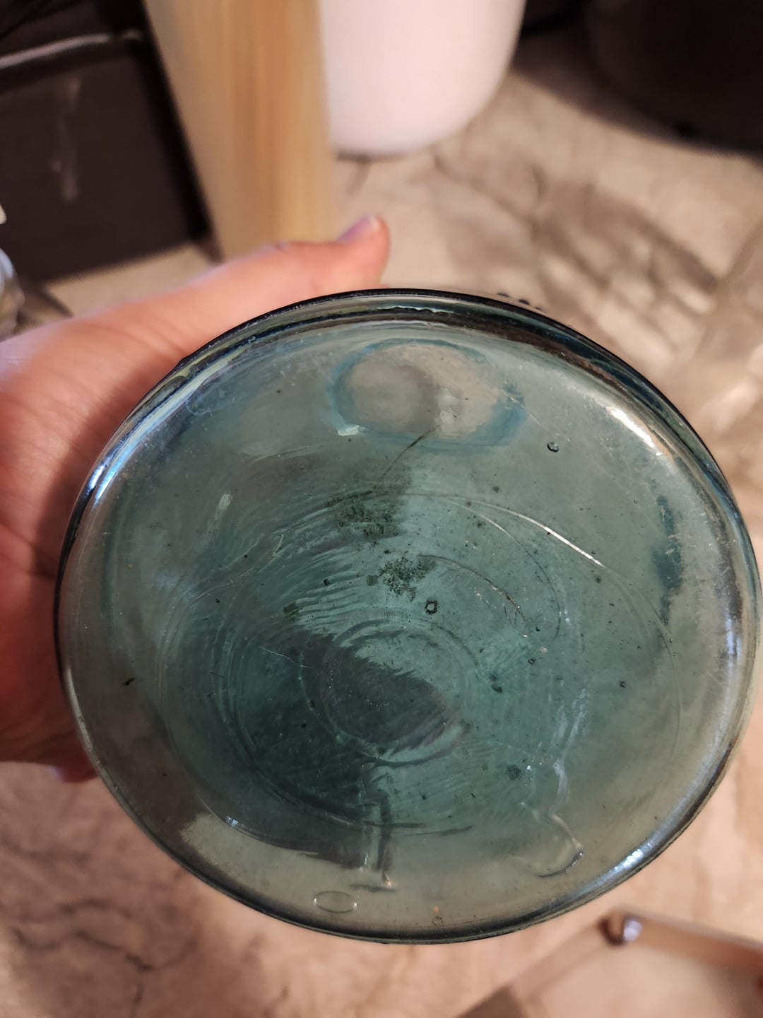 That jar is around 110 – 120 years old. The blue glass is “Hoosier Blue” – the same came from Indiana Dunes.