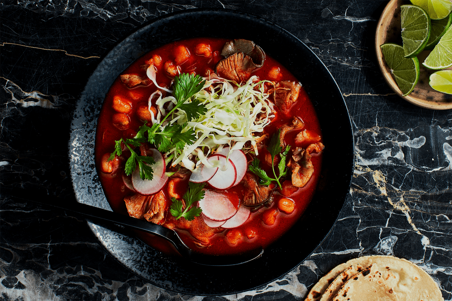 Pozole traditionally contains chicken or pork, but this vegan version from Edgar Castrejón subs in earthy oyster mushrooms for umami flavor and chew. Two types of chiles bring heat and vibrant color to the dish.