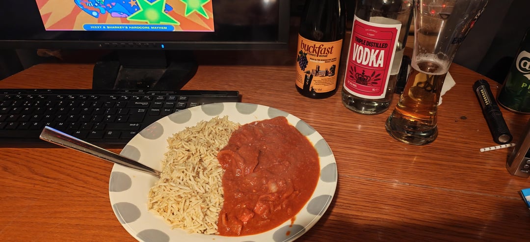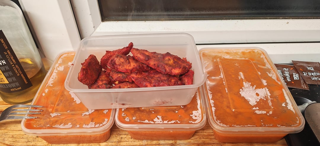 Chicken tikka cooked in oven due to drunken neglect of charcoal sack being left out in rain.