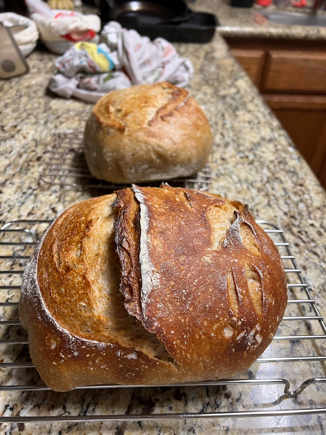 These are rosemary sourdough loaves. I used the recipe below and bulk fermented in the oven with the light on for 6 hours and it went into the fridge for about 18 hours before I could bake these loaves.