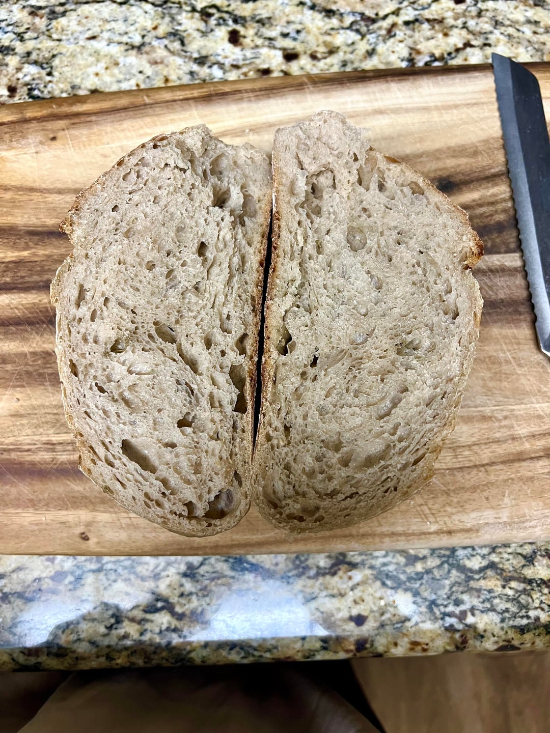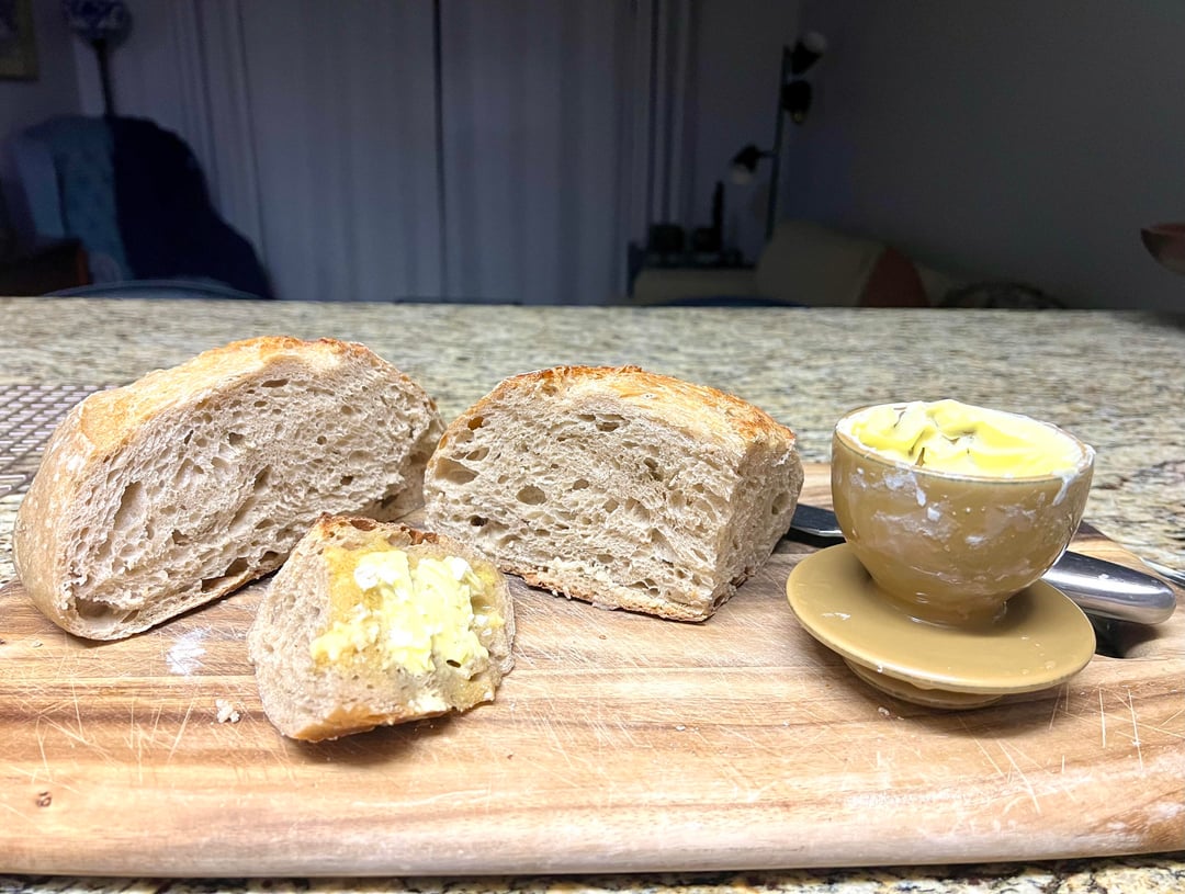 The recipe is for one loaf, but I doubled it to make two loaves. Next time I’m not going to use the mixer to see if there’s any difference. I was pleasantly surprised by this first effort.