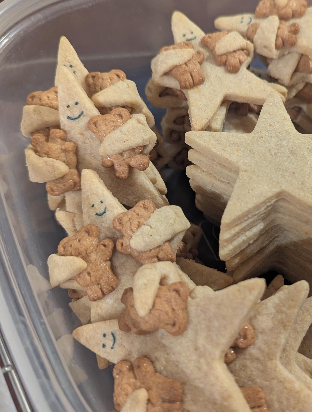 Roll the dough out on a flour-dusted surface and cut out the star shapes. Add the teddy grahams, carefully roll out the “arms” a bit more to elongate them and wrap them around the bears.