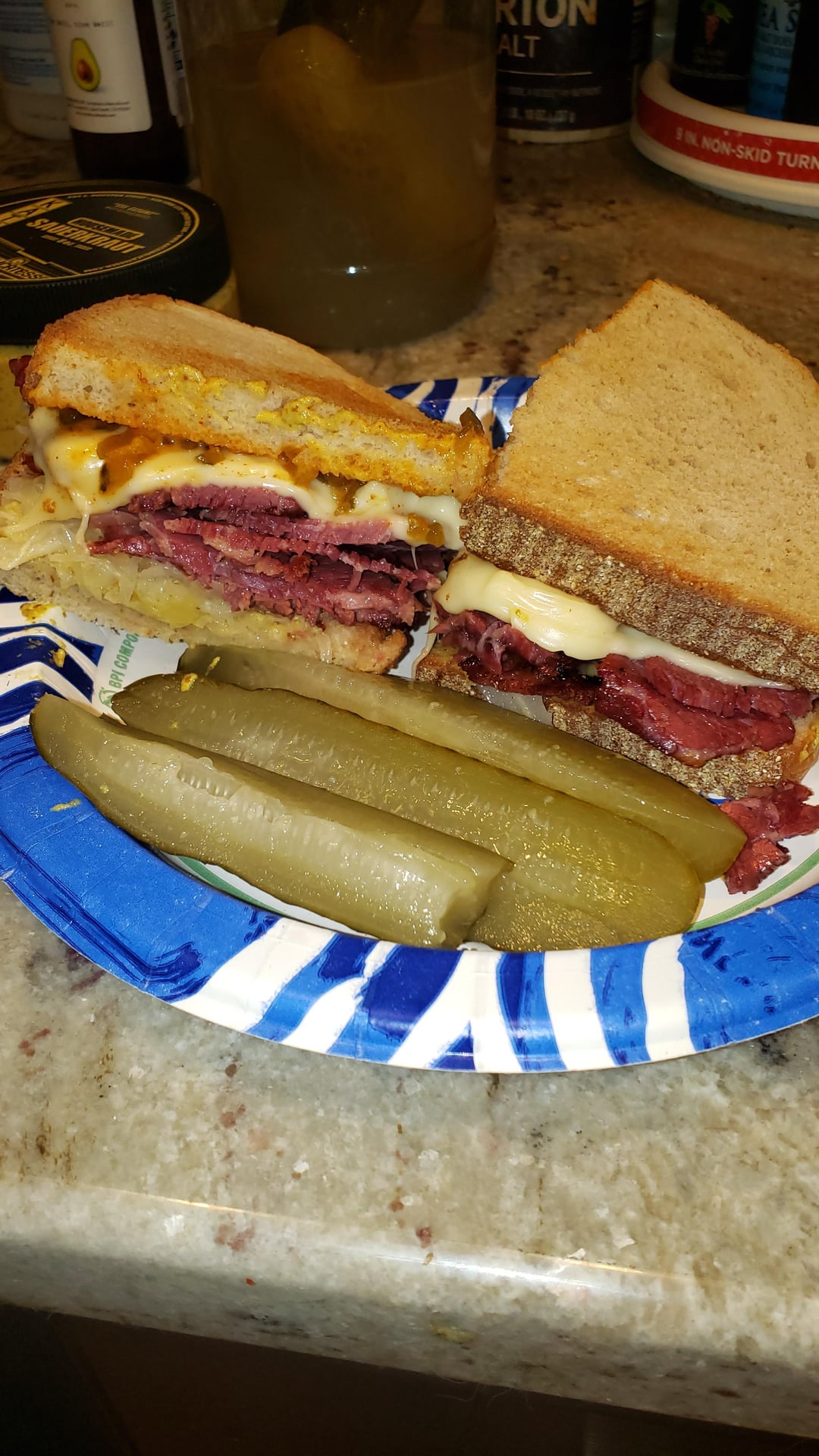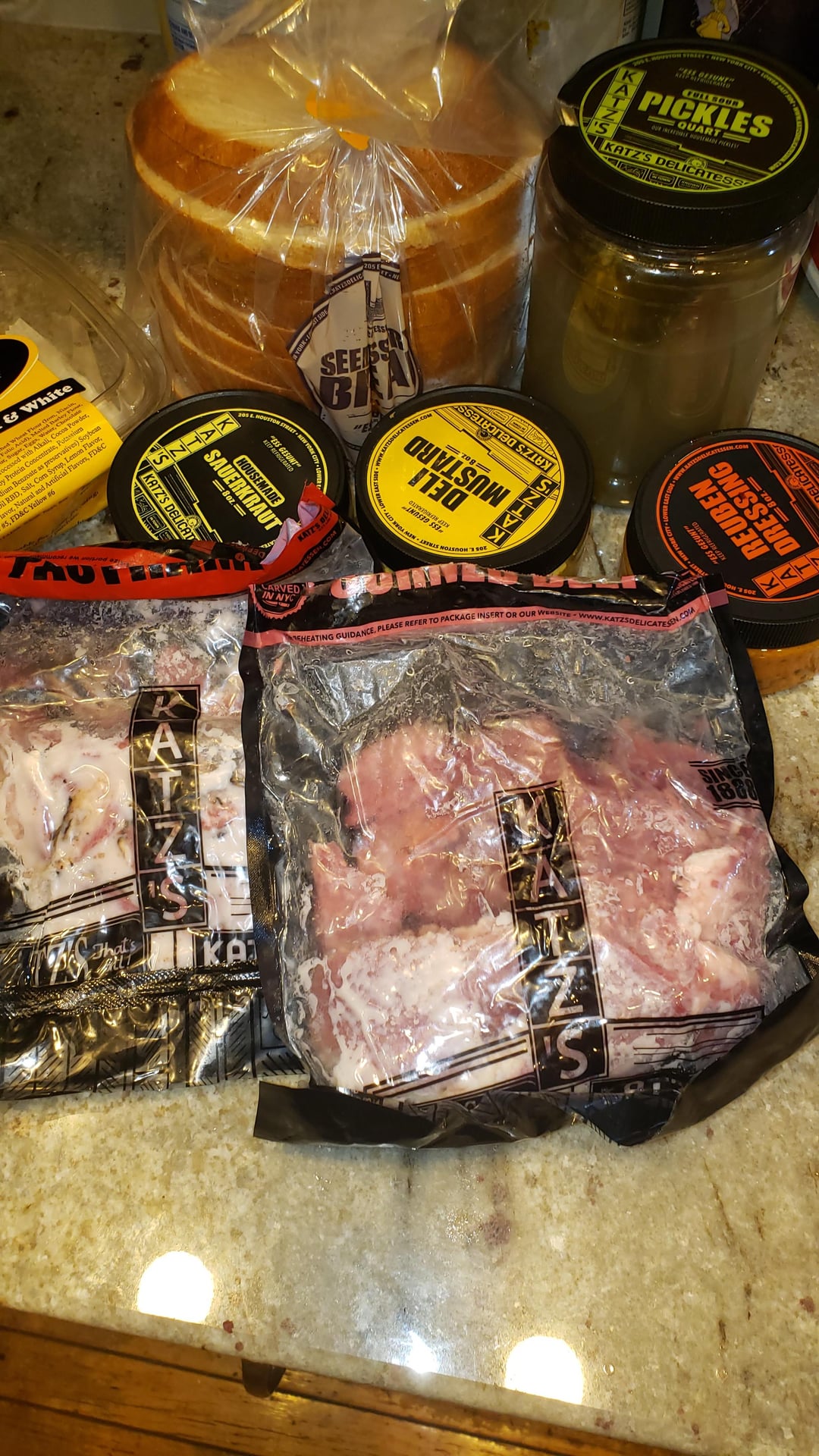Got pastrami and corned beef Ruben delivered from Kat's. Comes deconstructed with enough to make plenty sandwiches. Whole loaf of bread. Jar of saurkraut, deli mustard, thousand island, whole sour pickles, brick of sliced cheese. I warmed as it says on package. Put some on a skillet a couple mins to melt cheese and voilà! 🤌🏽 Taste like I just picked up from the deli! And I Don't even live in NY