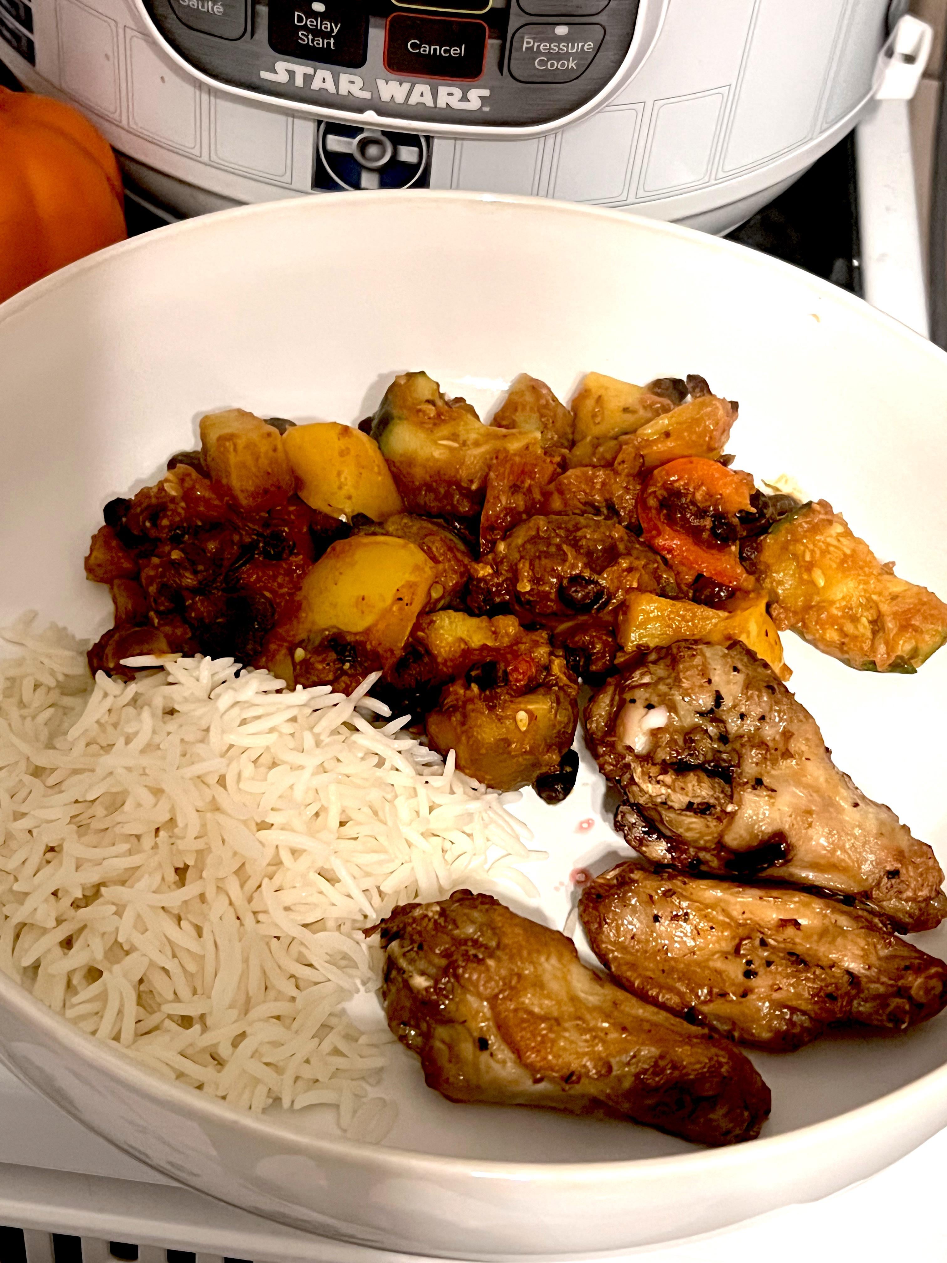 With a small portion of rice! All in all for this plate it’s about 430 cal for 35 grams of protein for the pictured plate. *I added the sauce of the chilli after to show the proportion of vegg!