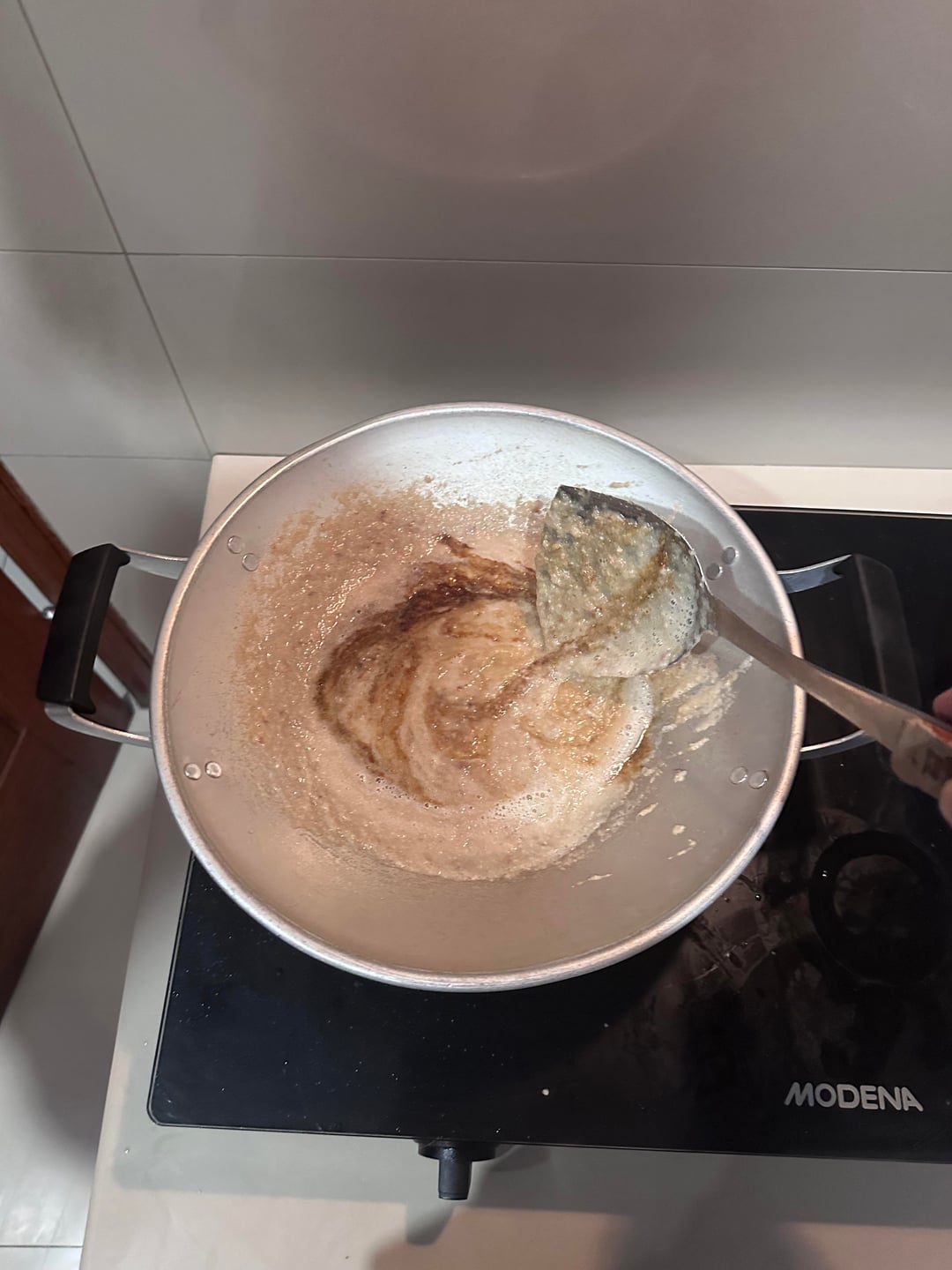 Heat oil in a pan and sauté the spice paste over medium heat until fragrant and slightly oily.