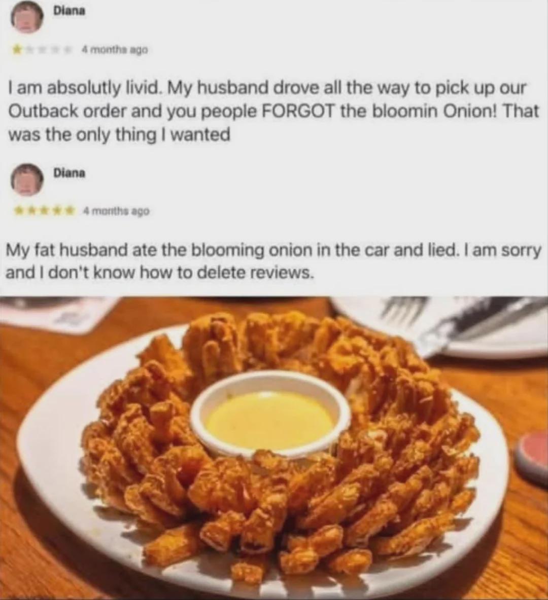 You let your husband drive ALONE involving that blooming onion and YOU are pissed off at him. There is something not right going on!!!!!