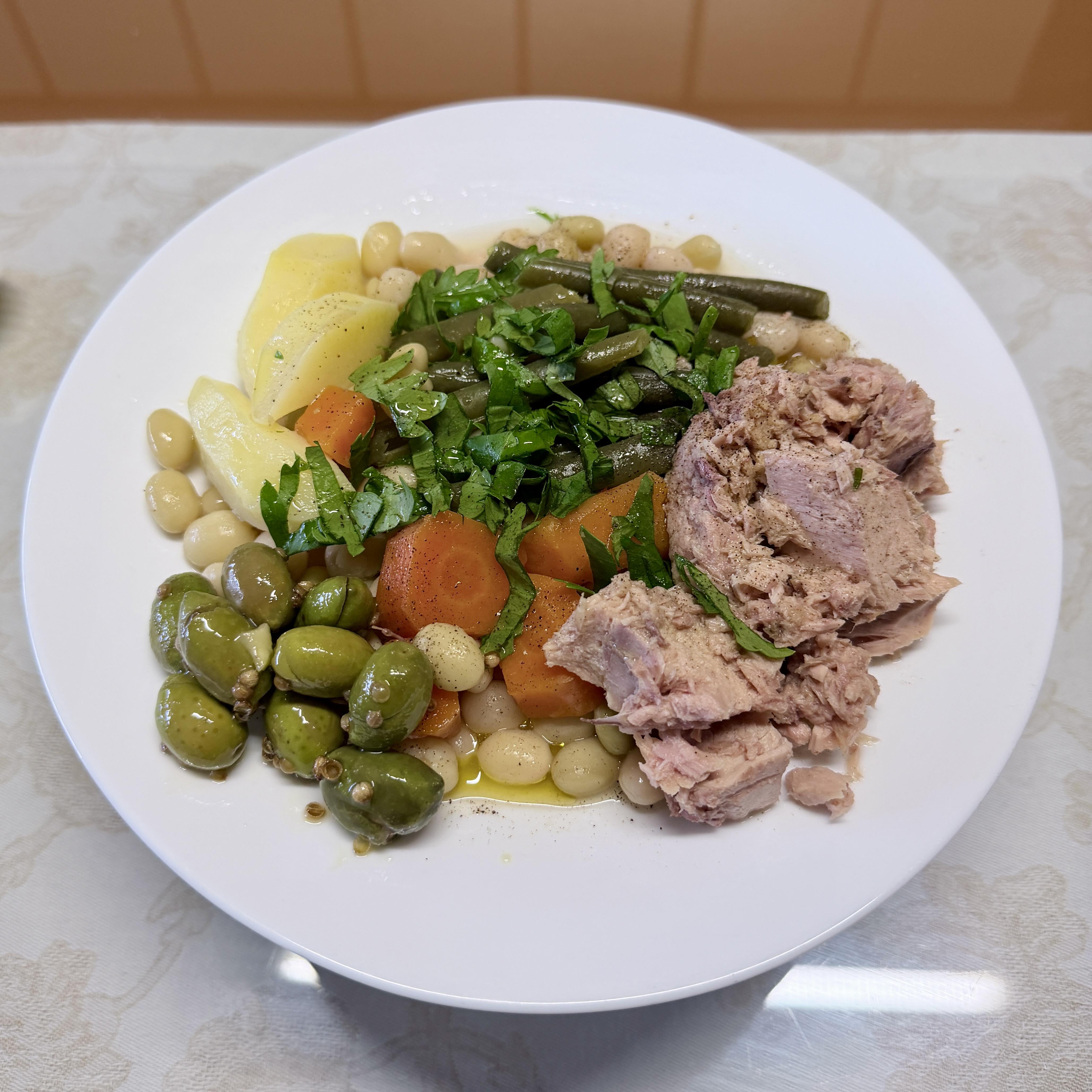 This looks really good! Is this tuna and cooked green beans, carrots, potatoes, and beans with some green olives? Can I ask what kinds of beans are those?