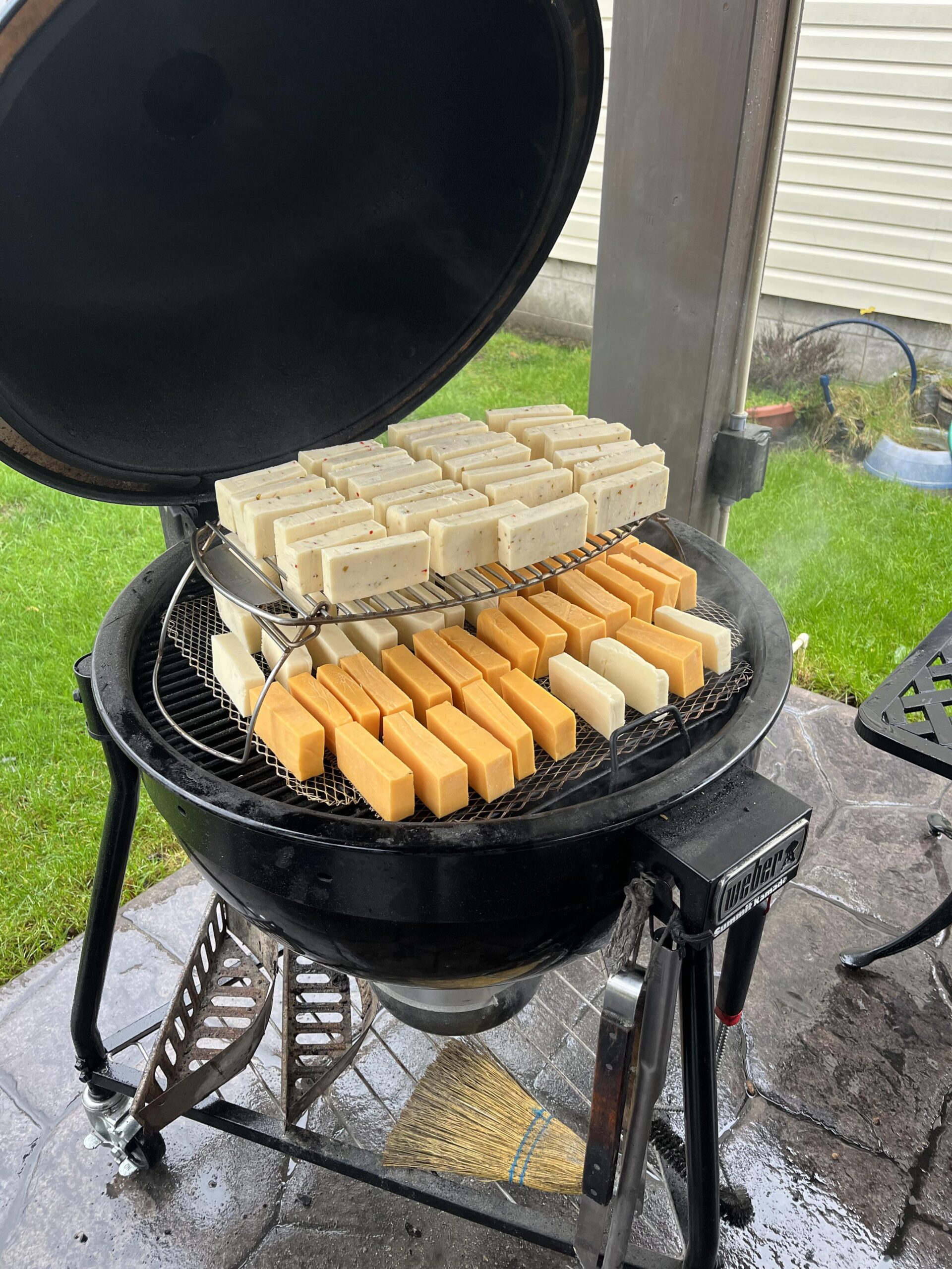 That's a Weber Summit Kamado and there's a smoke tube at the bottom filled with a mix of oak wood pellets and cherry wood chips to give it smoke (the chips) but without going out (the pellets). You let that flame for a few minutes and blow it out then it will smolder for 4+ hours. Above that is the diffuser plate and sitting on the diffuser plate is a drip pan full of ice just to ensure that on this 50 degree day the cheese doesn't get hot.