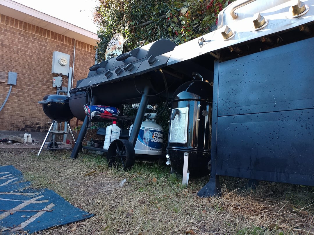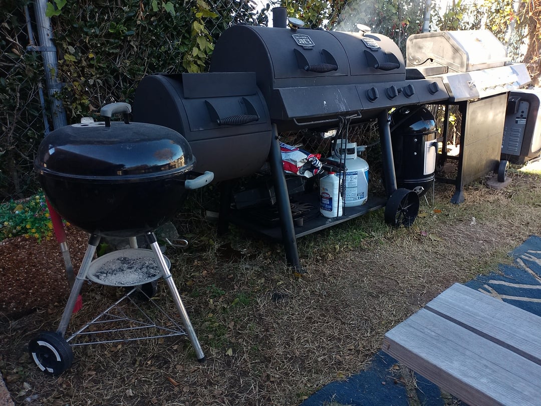 I agree. You gotta get that blue bag and lighter fluid outta here. Otherwise looks good. Love my Weber Smokey Mountain 22. Have you been looking at offset smokers yet? 🙂