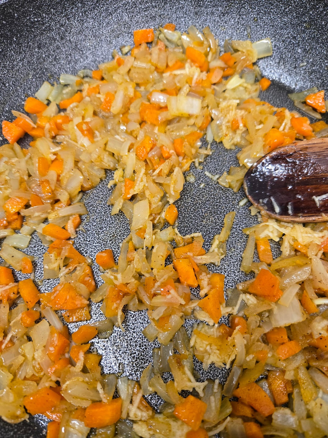 2. Dice one onion or 3-4 shallots then add to the pan after 5 minutes of the carrots frying