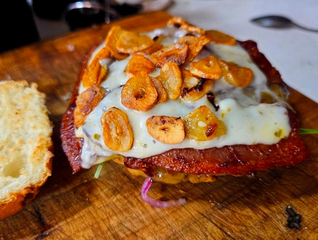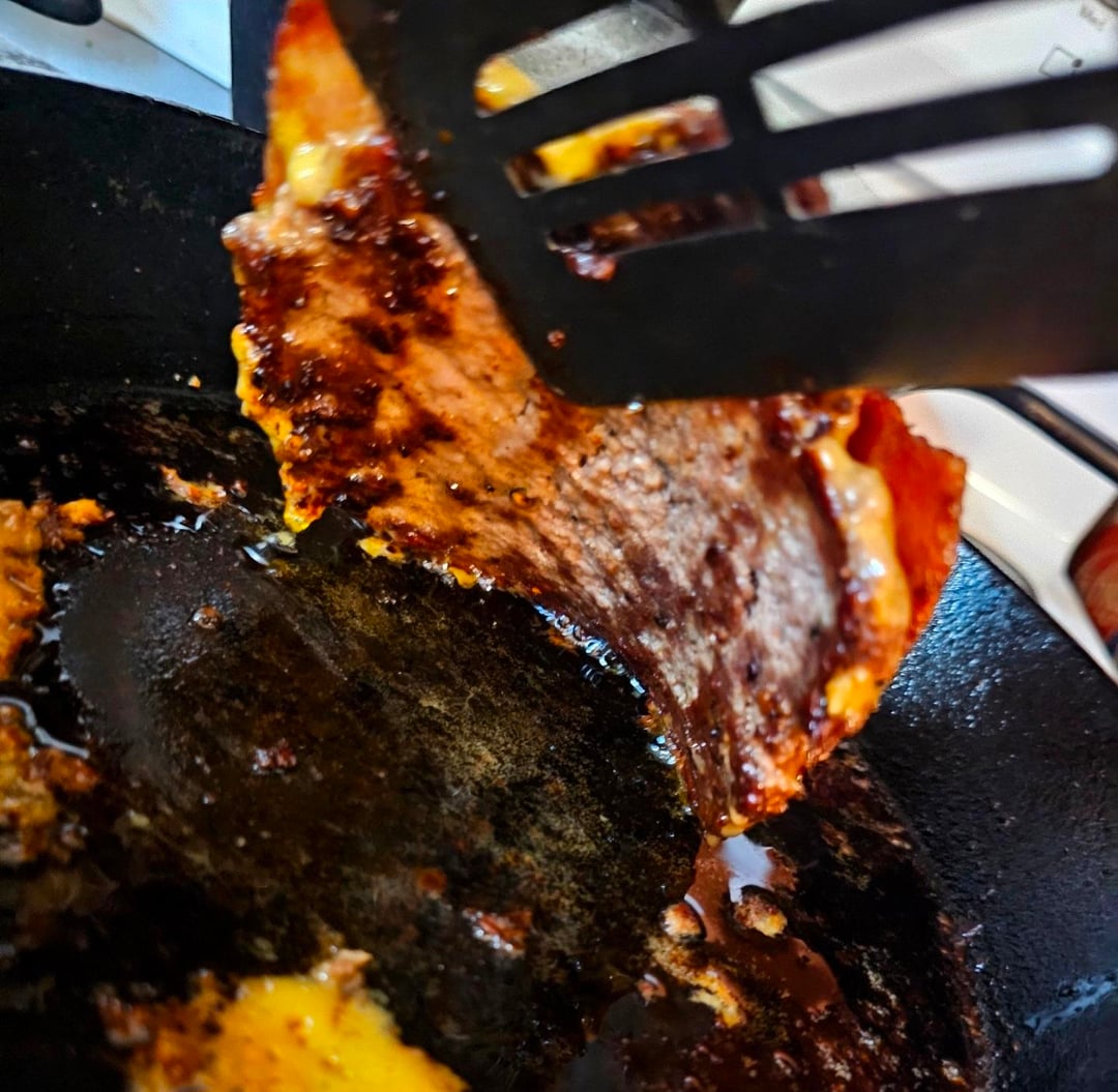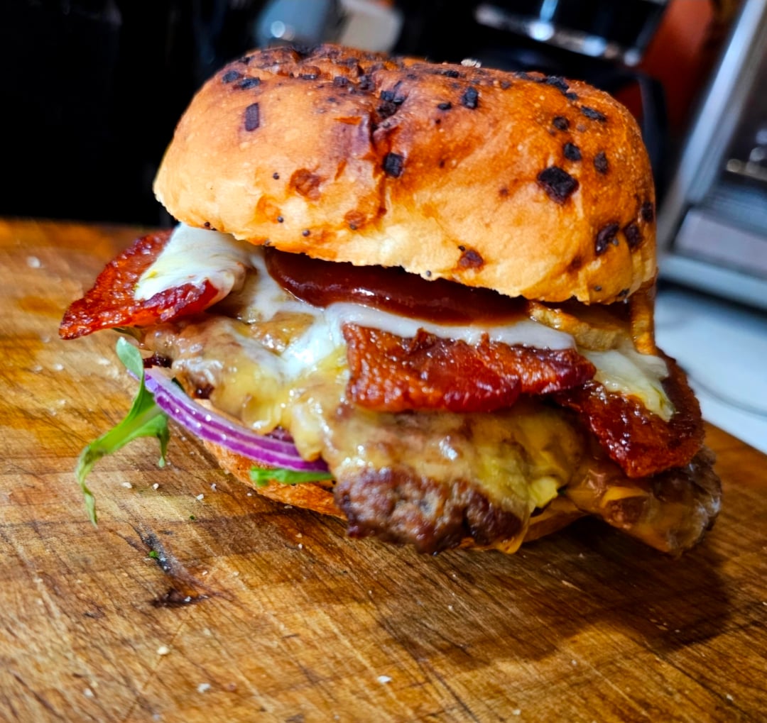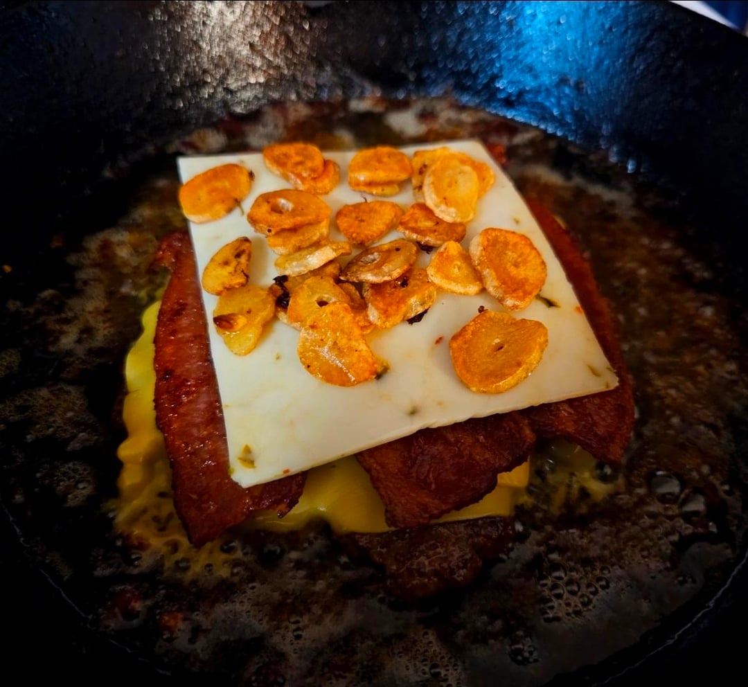 Make a ball of SPPOG seasoned beef, cook a few strips of bacon and crisp up some garlic in the fat, then smash your meat into the garlicky bacon fat. Brown, flip, add cheddar, bacon, pepperjack, and the crispy garlic, then wait for the bottom to brown.