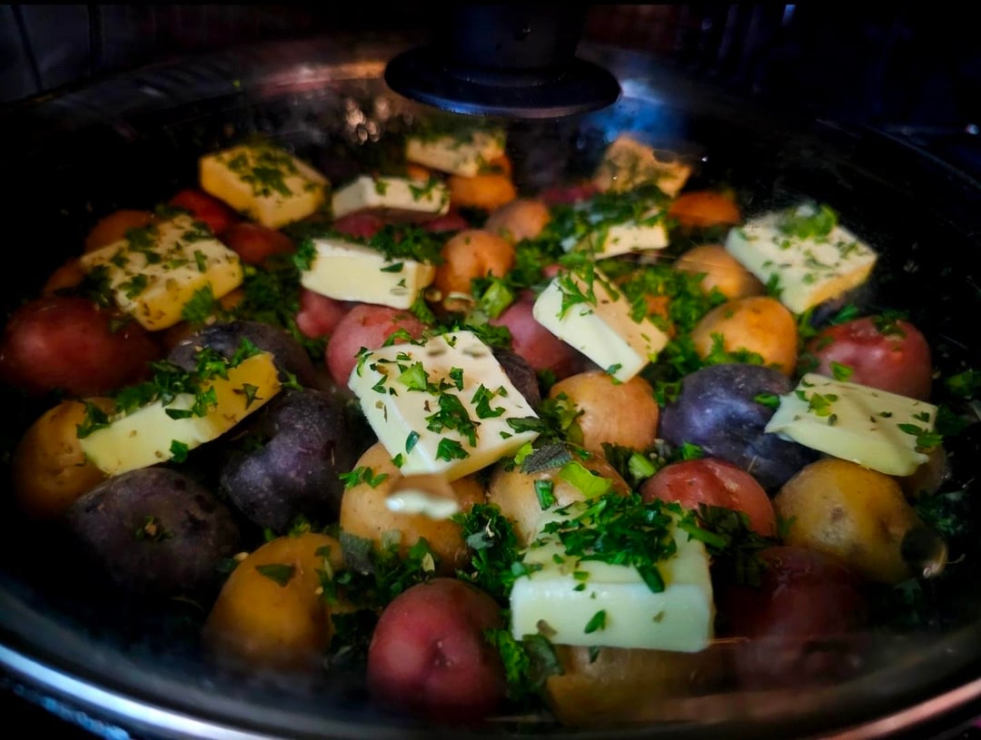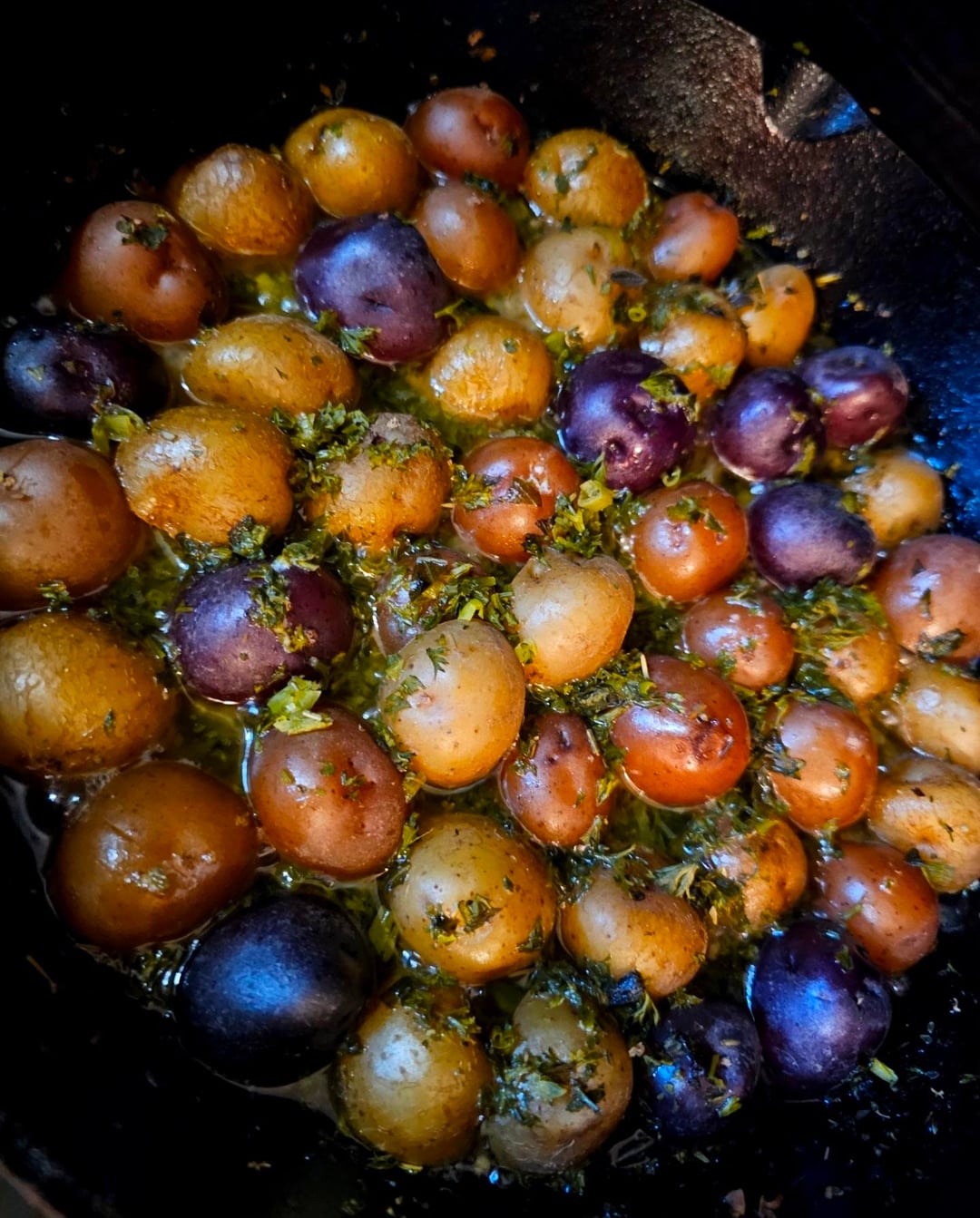 Lube up a cast iron pan (pyrex dish also works) with some bacon fat, sprinkle it with salt & pepper, then add a layer of onion and garlic. Cut baby potatoes in half, place them cut side down, add butter on top with some parsley, basil, & scallions. Cover & bake @ 375° until the bottoms brown then toss them around in the pan to coat them with the leftover butter.