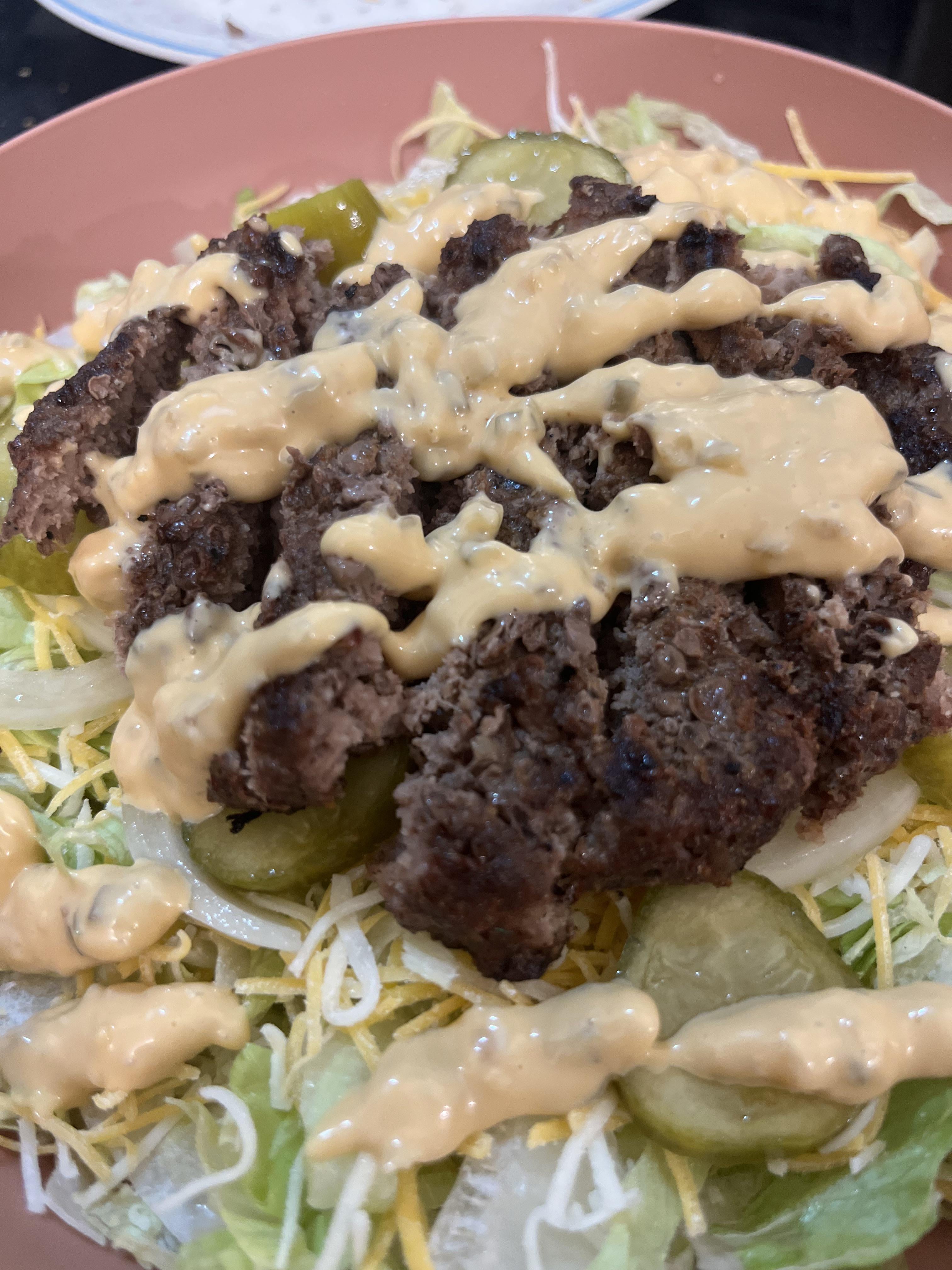 This is like a once a week meal for me. I love a burger salad. I usually throw some fries on top lol