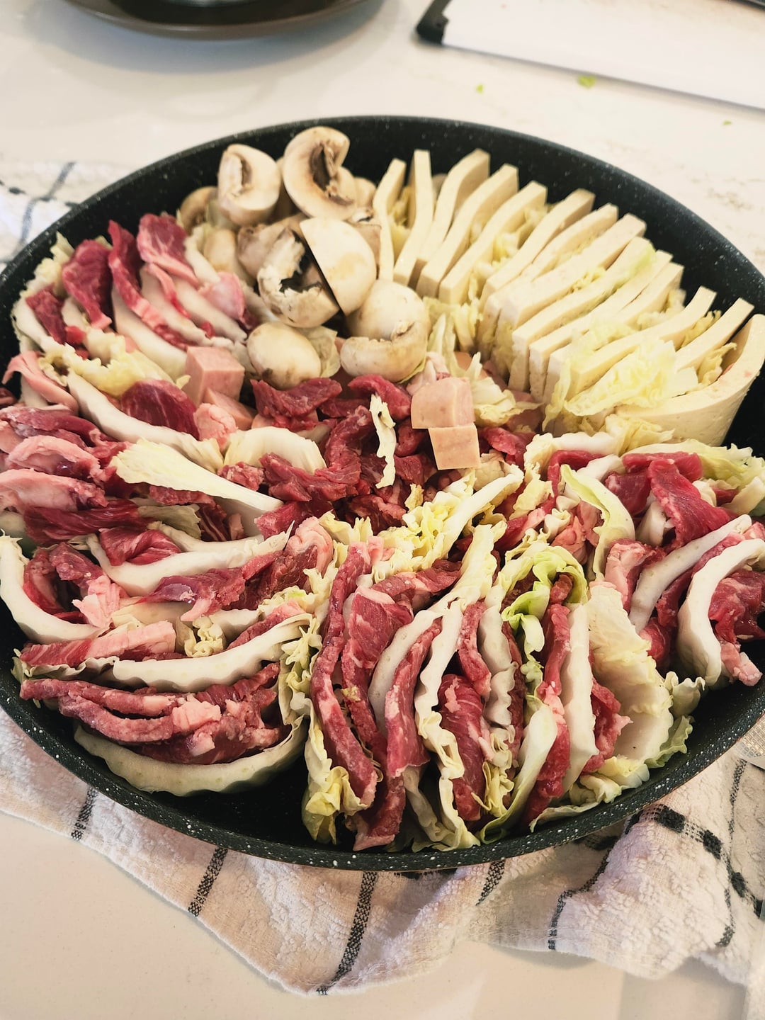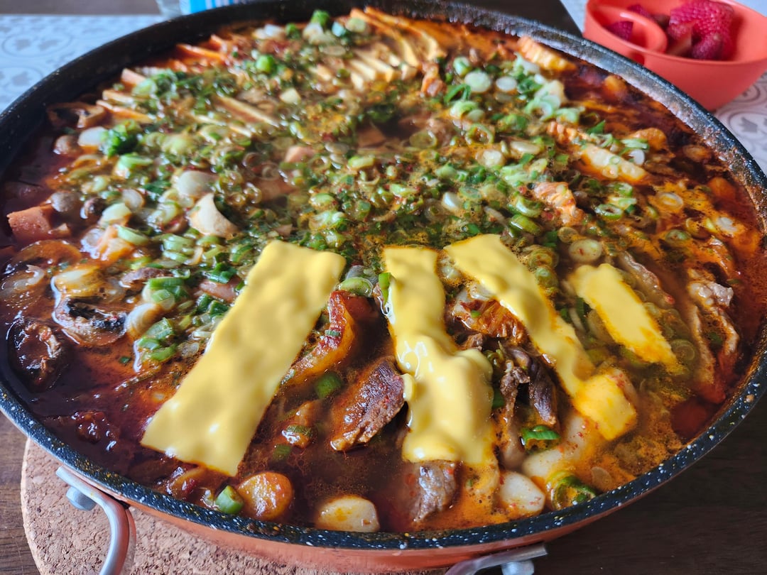These days, it’s make the broth / soup portion first, add protein, tofu, tteokbokki, and let things summer fir 45min so the proteins get soft. 10-15 min before im ready to eat i add the mushrooms and vegetables. Adding the veg like I have in the pic looks nice and all, but they end up overcooking.