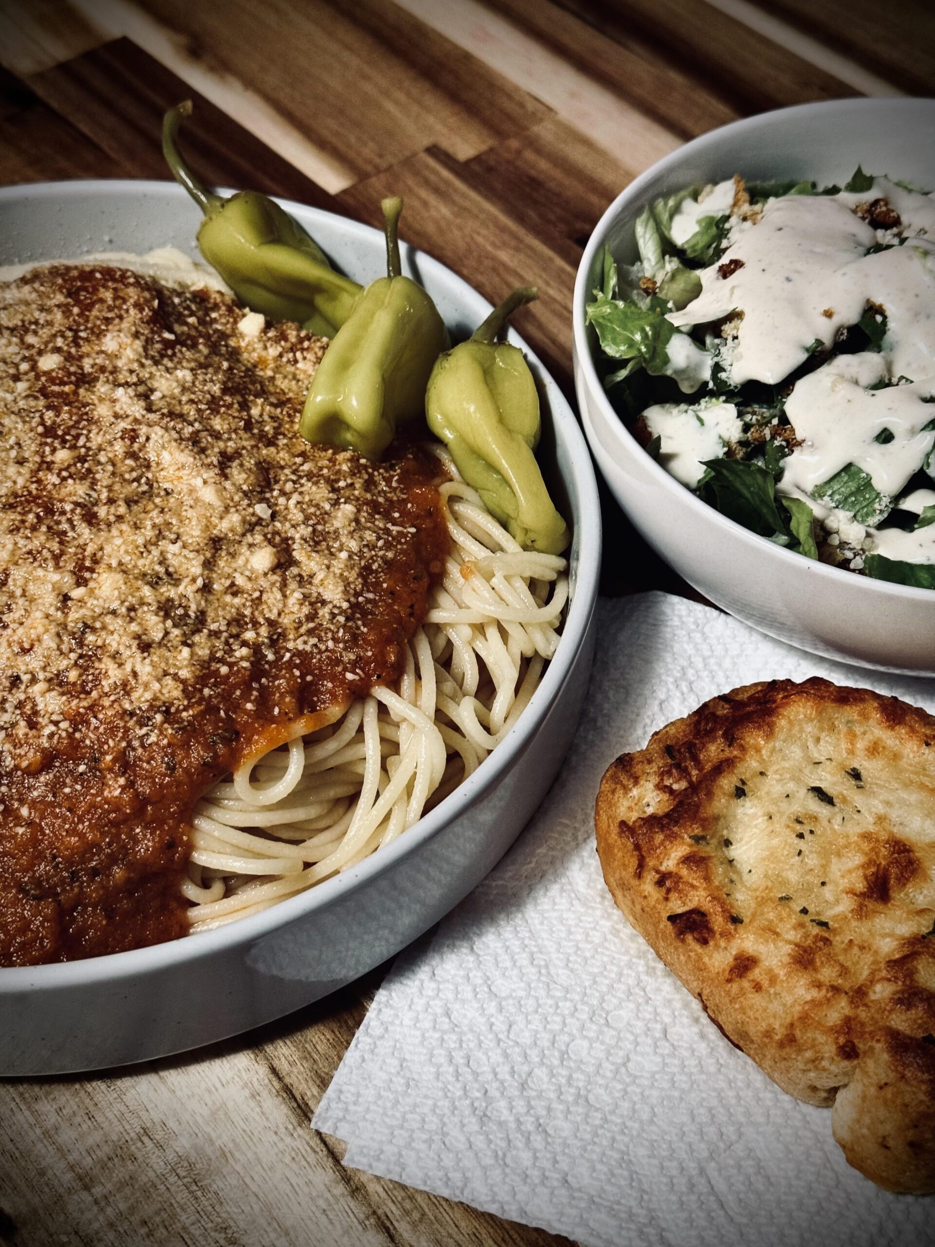 Scratch made sauce over spaghetti topped with Parmesan & Romano cheese, Caesar side salad w/ garlic bread. Exceptional meal