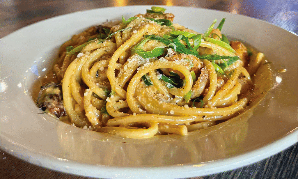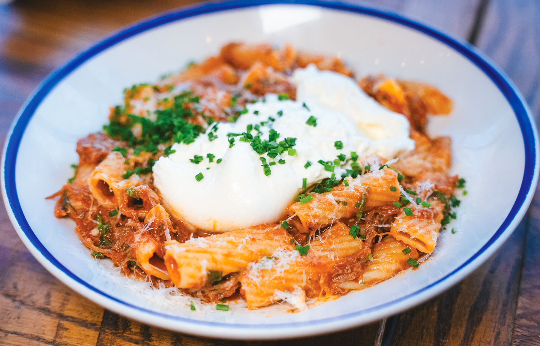 From upscale and unusual items like pear and burrata pizza (right) and comfort foods like boneless crispy chicken wings (below left) and rigatoni beef ragu (below right), plus the always-happening craft cocktail bar, Noble Crust continues to please the masses in Wesley Chapel.