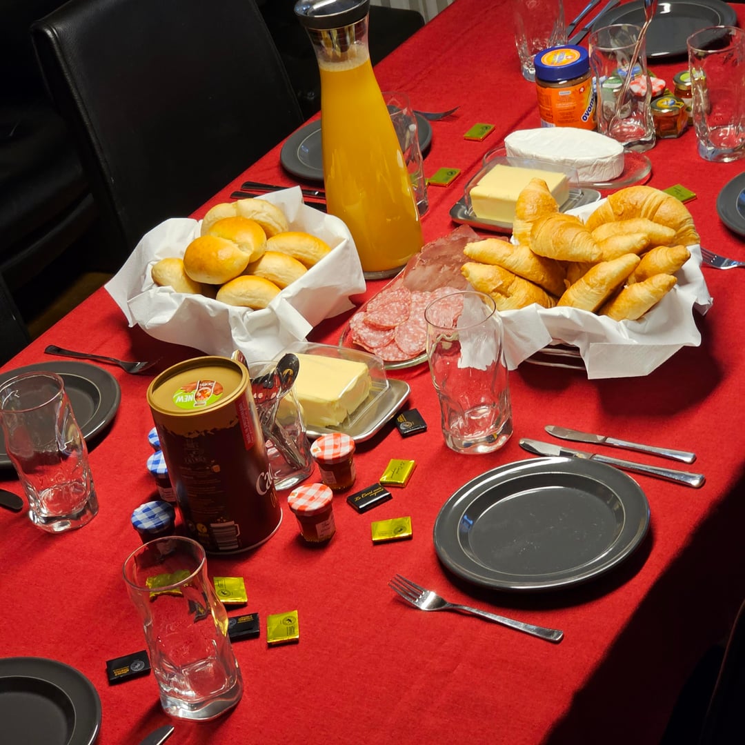 Also on the pic: Citterio salami, orange juice, various honeys and jams, Caprice-des-Dieux and butter.