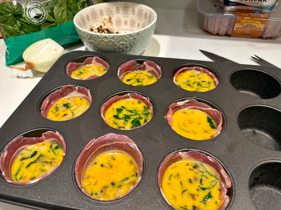 * egg muffins (180• for 15 minutes in the oven) with bacon, spinach, mushrooms and onions; veggies on the side: cucumber, peppers, tomatoes)