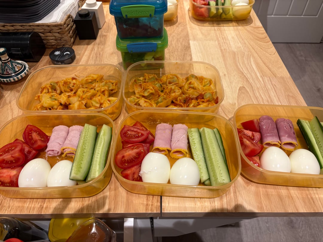 * boiled eggs, ham, veggies (cucumber, tomatoes)