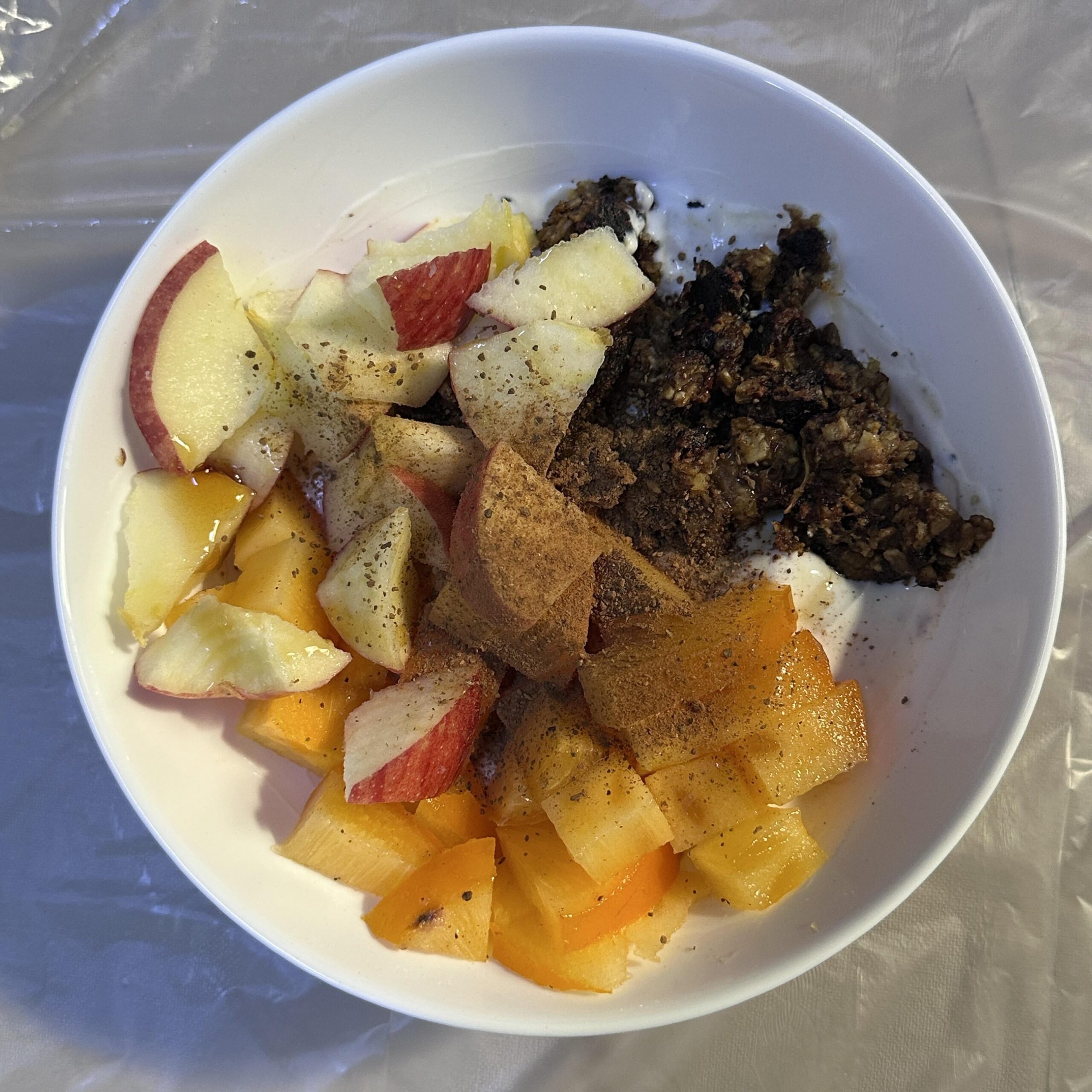 yogurt, honey, scrambled oats, persimmons, apple, cinnamon