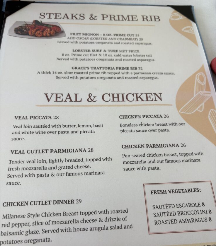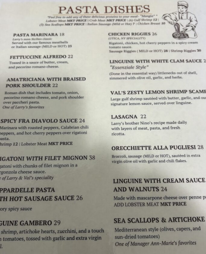 The menu features a whole page of pasta dishes from lasagna to pasta marinara, fettuccine Alfredo, linguine gambero, meatballs, spaghetti alla carbonara to sea scallops, linguini with cream sauce and walnuts, and artichoke hearts (one of Manager Anne-Marie Hein’s favorites).