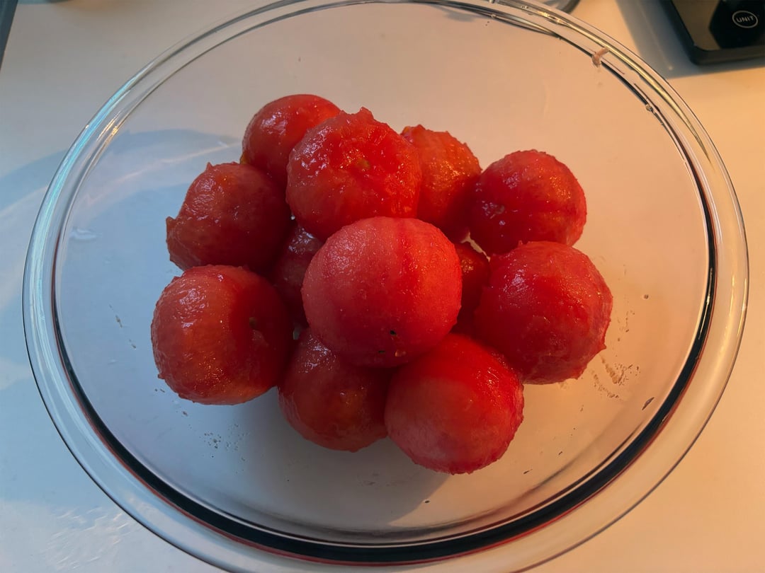 – Bring a large pot of water to a boil. Place tomatoes a few at a time in the water and remove after 10-15 seconds.