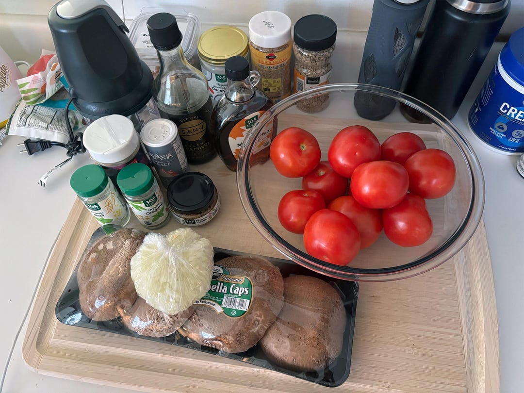 – 12-14 tomatoes, (fresh, garden tomatoes work best- appx. 6-8 lbs. You can also use two 28oz. cans of San Marzano tomatoes) – 2 tablespoons olive oil – 1 large onion, chopped – 8 ounces mushrooms, fresh, chopped – 2 teaspoons soy sauce, (see notes above) – 6 cloves garlic, minced – 10-12 basil leaves, chopped – 1 tablespoon oregano, finely chopped – 1-2 tablespoons brown sugar, (start with 1 tablespoon, taste, and add more as you go along as needed) – 1 tablespoon Kosher salt, (or to taste) – 1 teaspoon pepper, (or to taste)