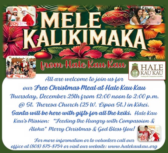 Hale Kau Kau, the daily meals ministry based at St. Theresa Church, will host a free Christmas dinner for the South Maui community next week.